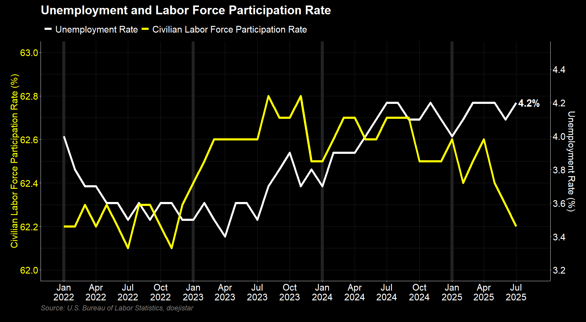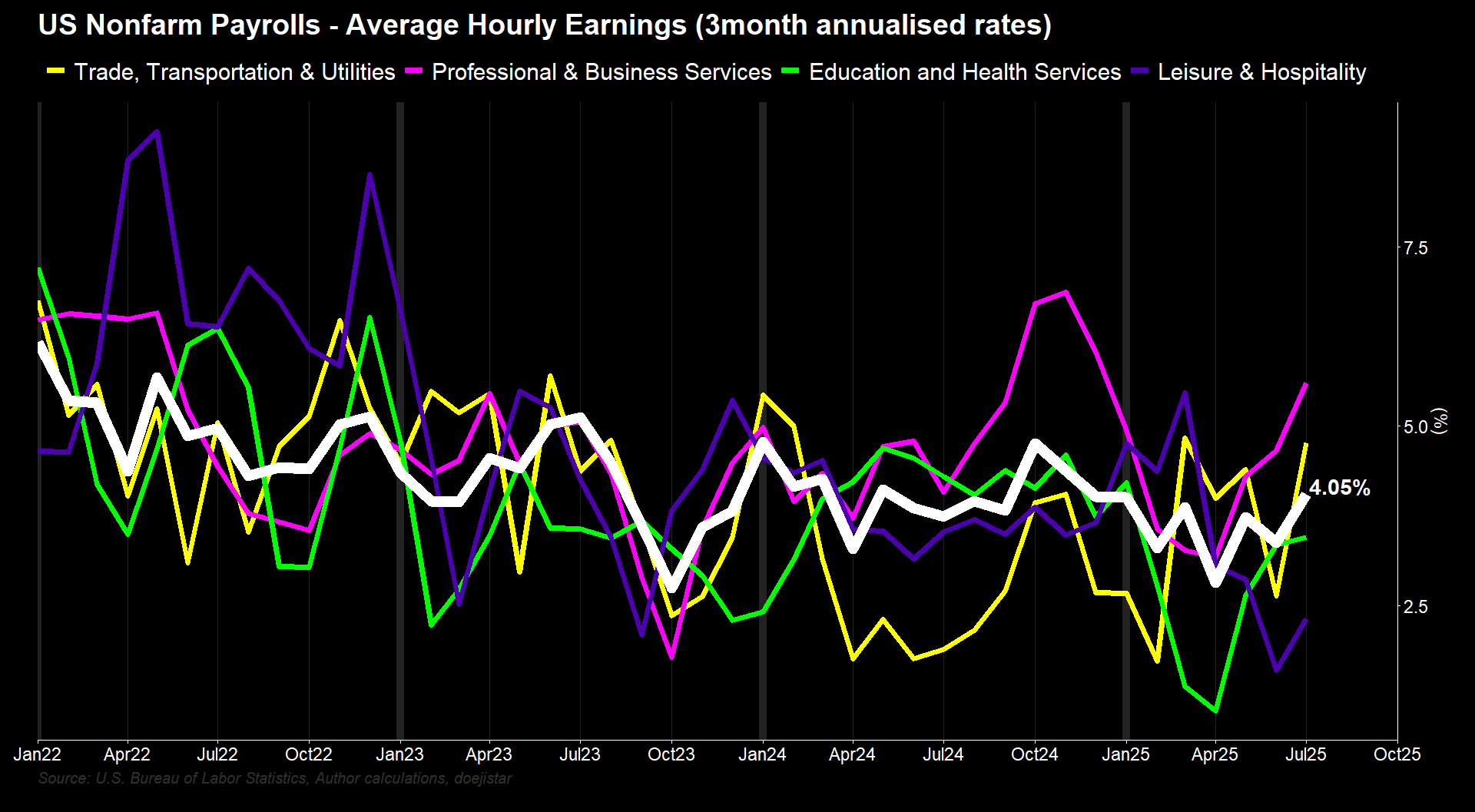 ECI, a bit of a favourite among the Fed as they regularly cite this measure in their speeches over the years describing it as their preferred or “gold standard” wage inflation metric. The QoQ measure has been steadily rising since the mid-2024 labour market related growth-scare and now sits at 3.81%, and consistent with the YoY establishment survey reading of 3.77% as of June, and 3.91% as of the July report last Friday.