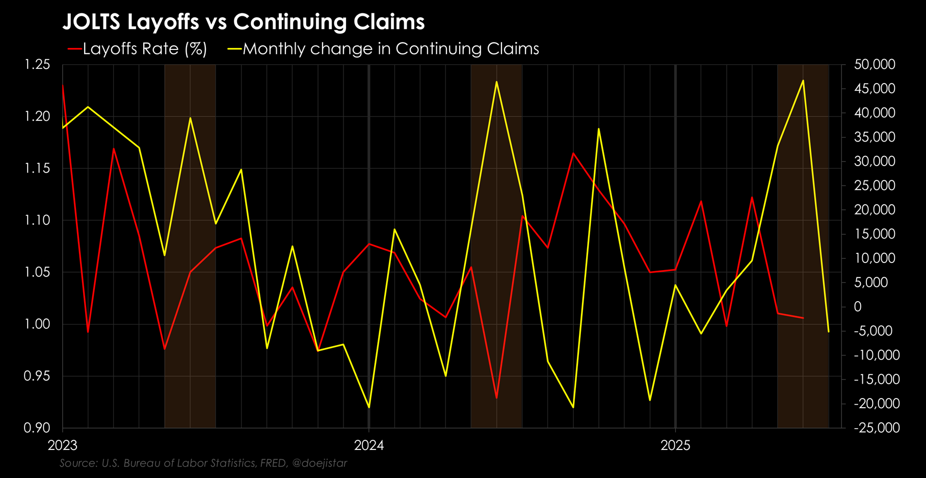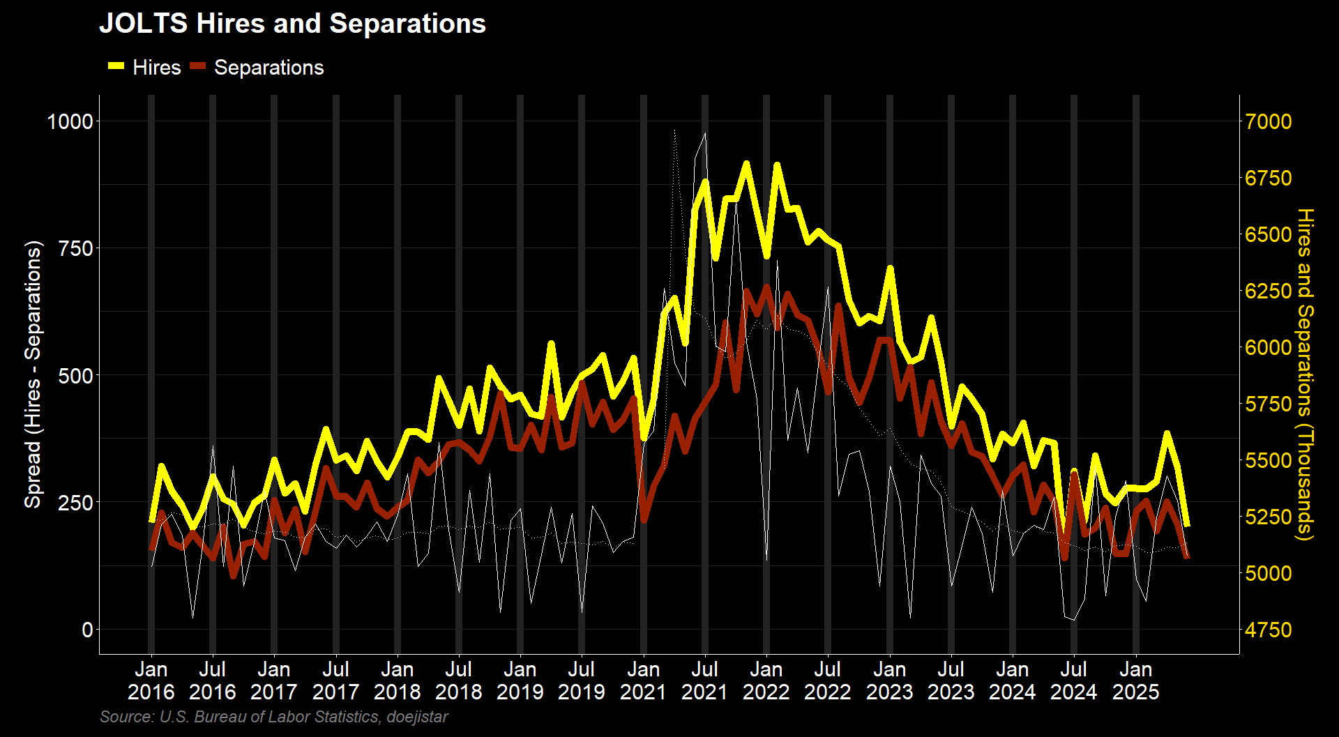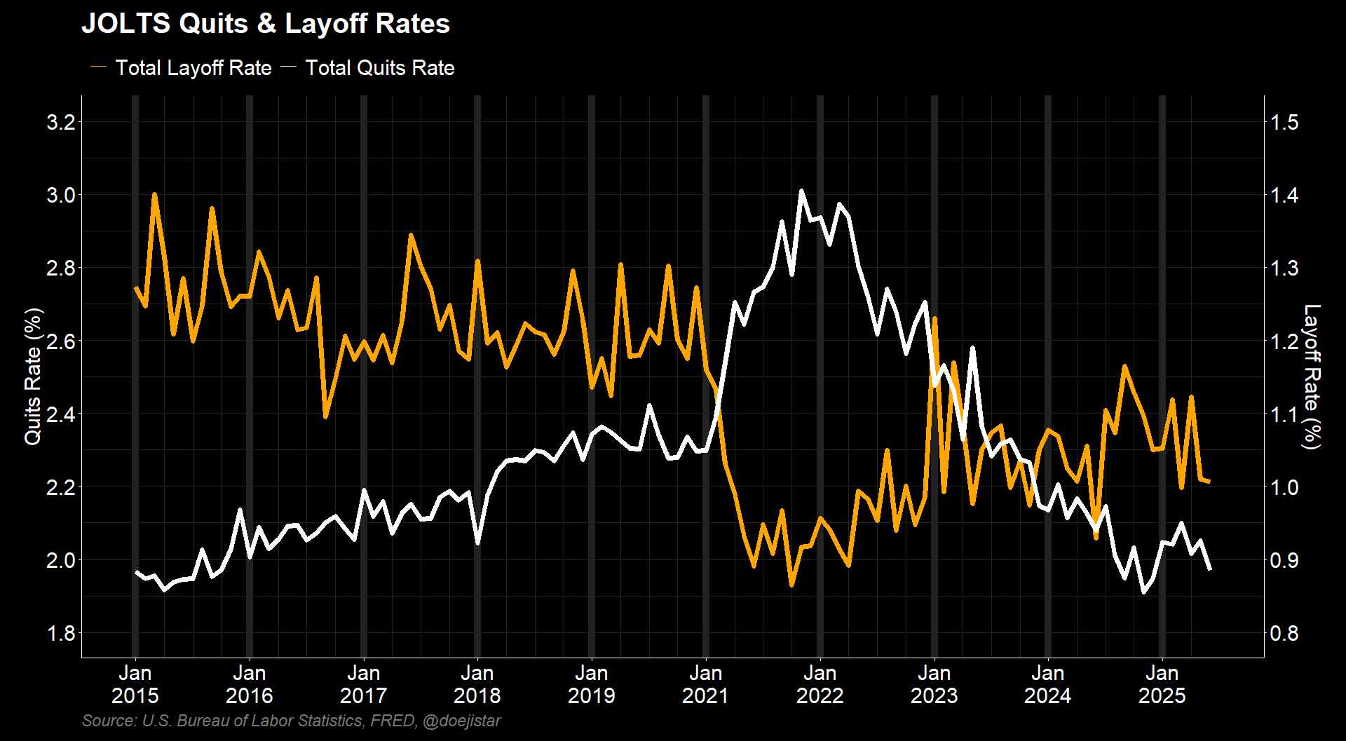 Notice in the above chart that 1) labour market turnover turned higher further into Trump 1.0 as his fiscally expansionary policies took hold via his Tax Cuts and Jobs Act in 2017, and increased Defense spending in 2018; then 2) surged during the pandemic spending into a period that was dubbed the “The Great Resignation”. That 5-year period from 2017 to 2021 was quite simply, exceptional. The kind of stale labour market dynamics as reflected by the most up to date NFP numbers we are increasingly seeing, I'd aruge, is just symptomatic of a structural shift to what the Fed describes as “being in better balance”.