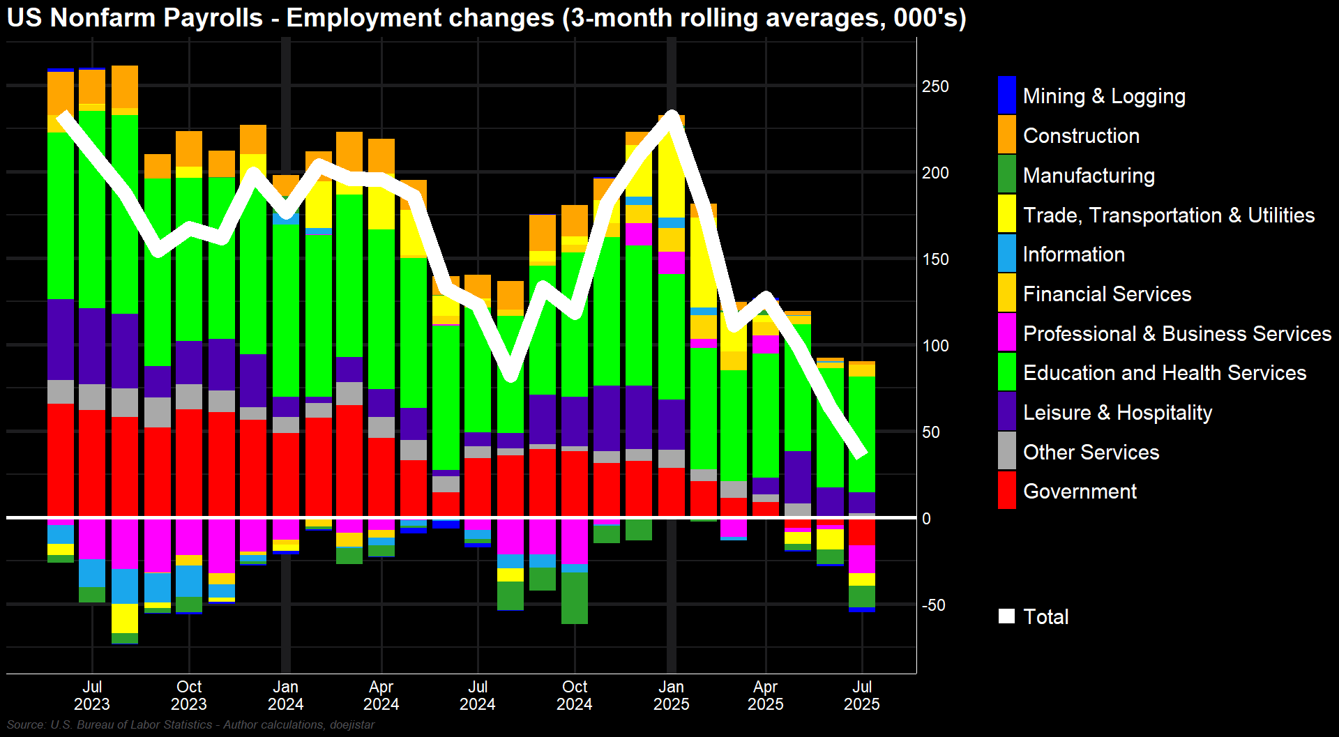 Powell noted that the breakeven job growth has fallen, almost as if said that with some emphasis. Considering that we’ve had above breakeven jobs growth in the early part of the year then dropped off sharply post Liberation-day, the YTD-average – for some perspective, is at 85k, which isn't far off the breakeven level of monthly job growth at 87k. Okay, not great... But let's dig deeper!