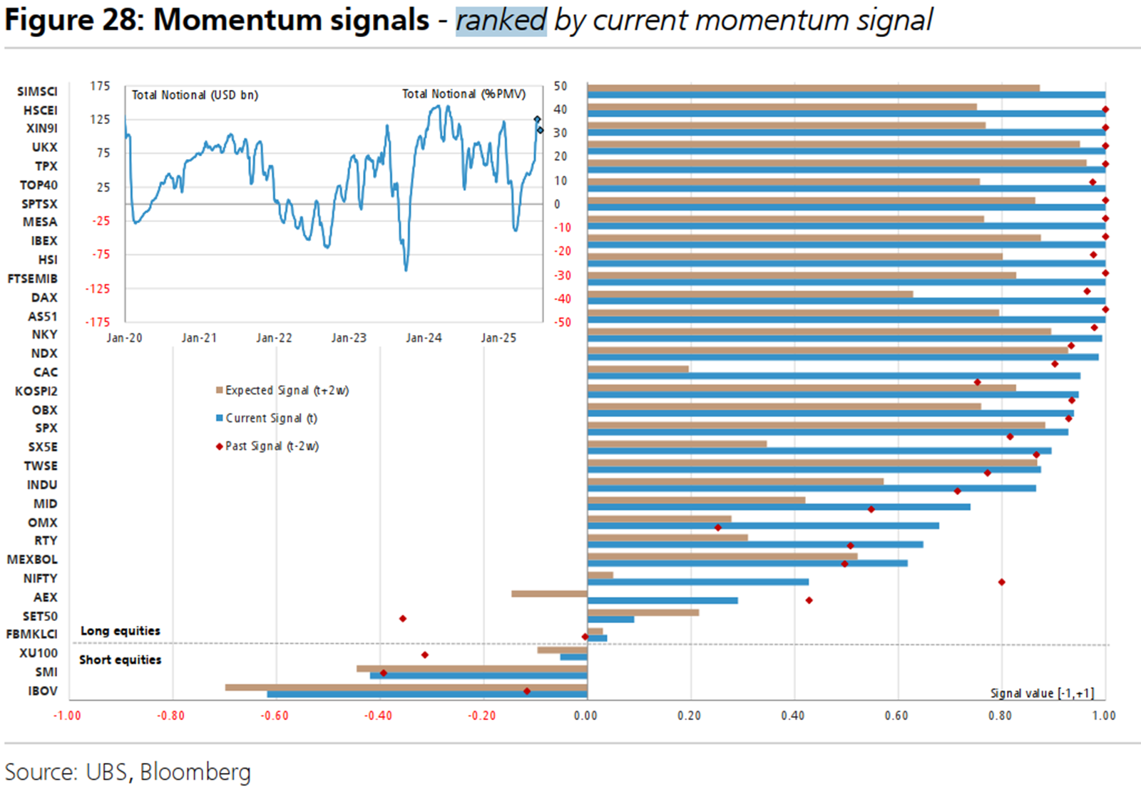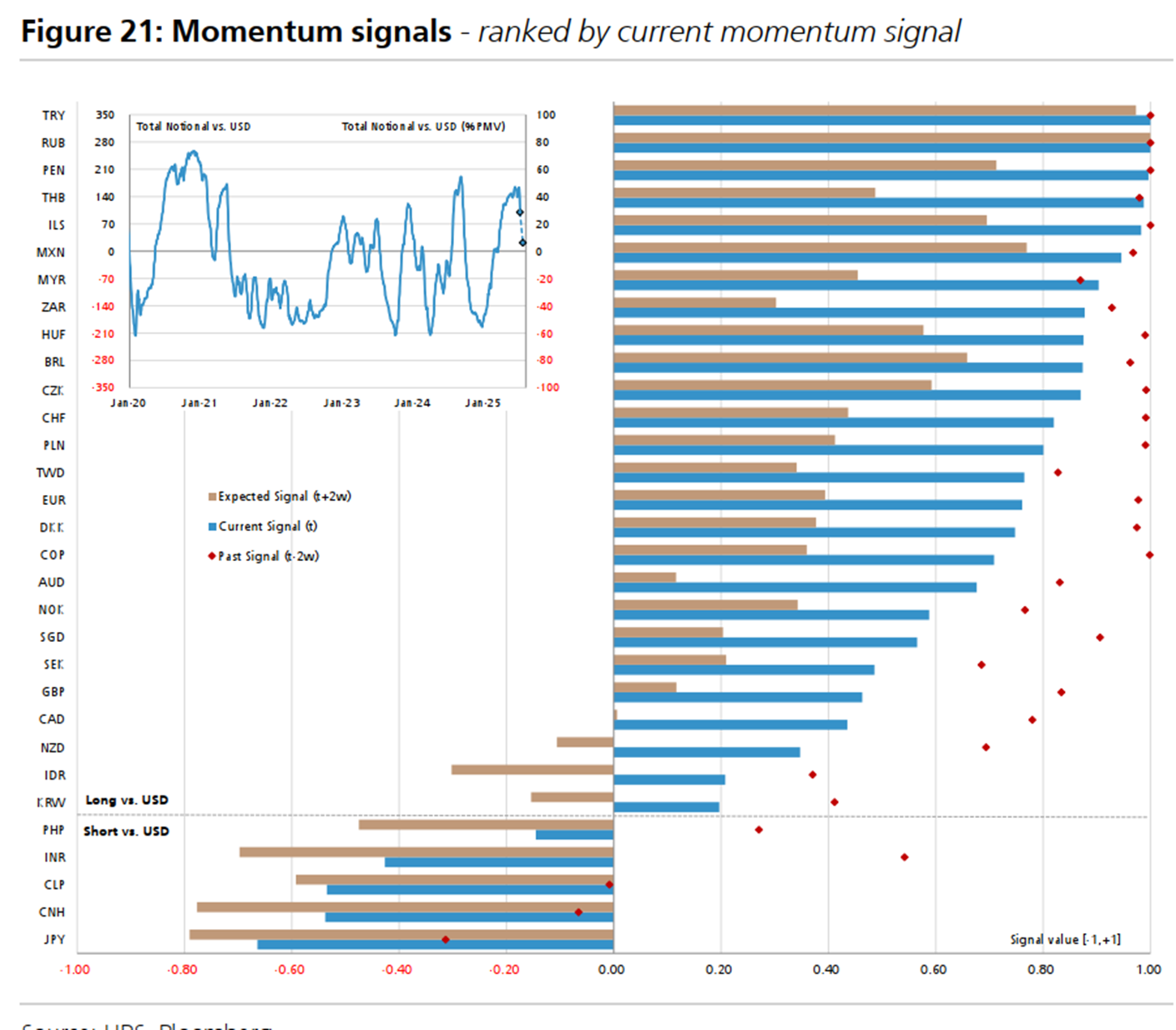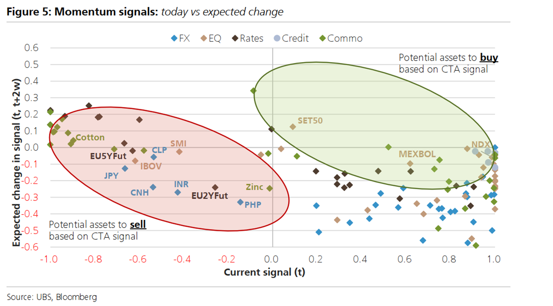 - UBS: CTAs are chasing JPY shorts and NDX longs. Chart shows potential assets to short or long based on CTA momentum signals.