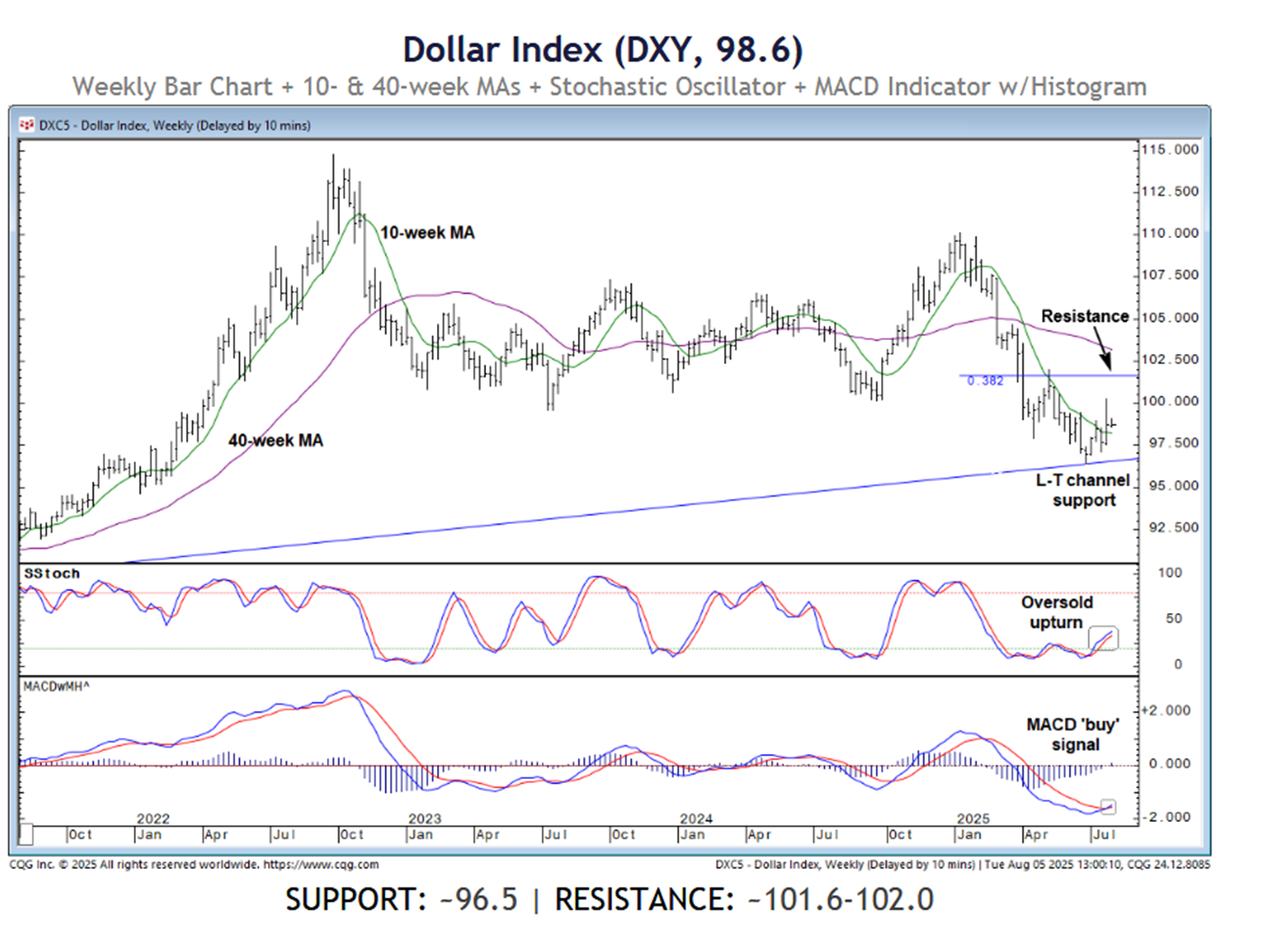 - On the DXY weekly, long-term trendline support held, leading to a small counter-trend rally, and supported by bullish crosses in momentum indicators.
