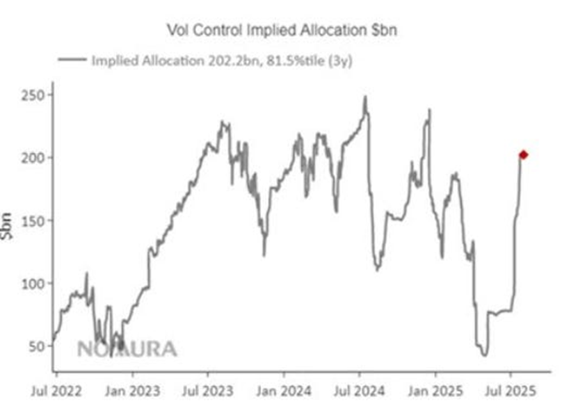 - Nomura: Total allocation of Volatility Control funds to the S&P 500 shows an implied allocation of $202.2bln, the 81.5th percentile over a three-year period.