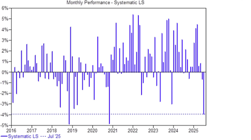 - Also from GS, systematic long/short hedge funds had their third-worst monthly performance in July 2025 in their entire data history.