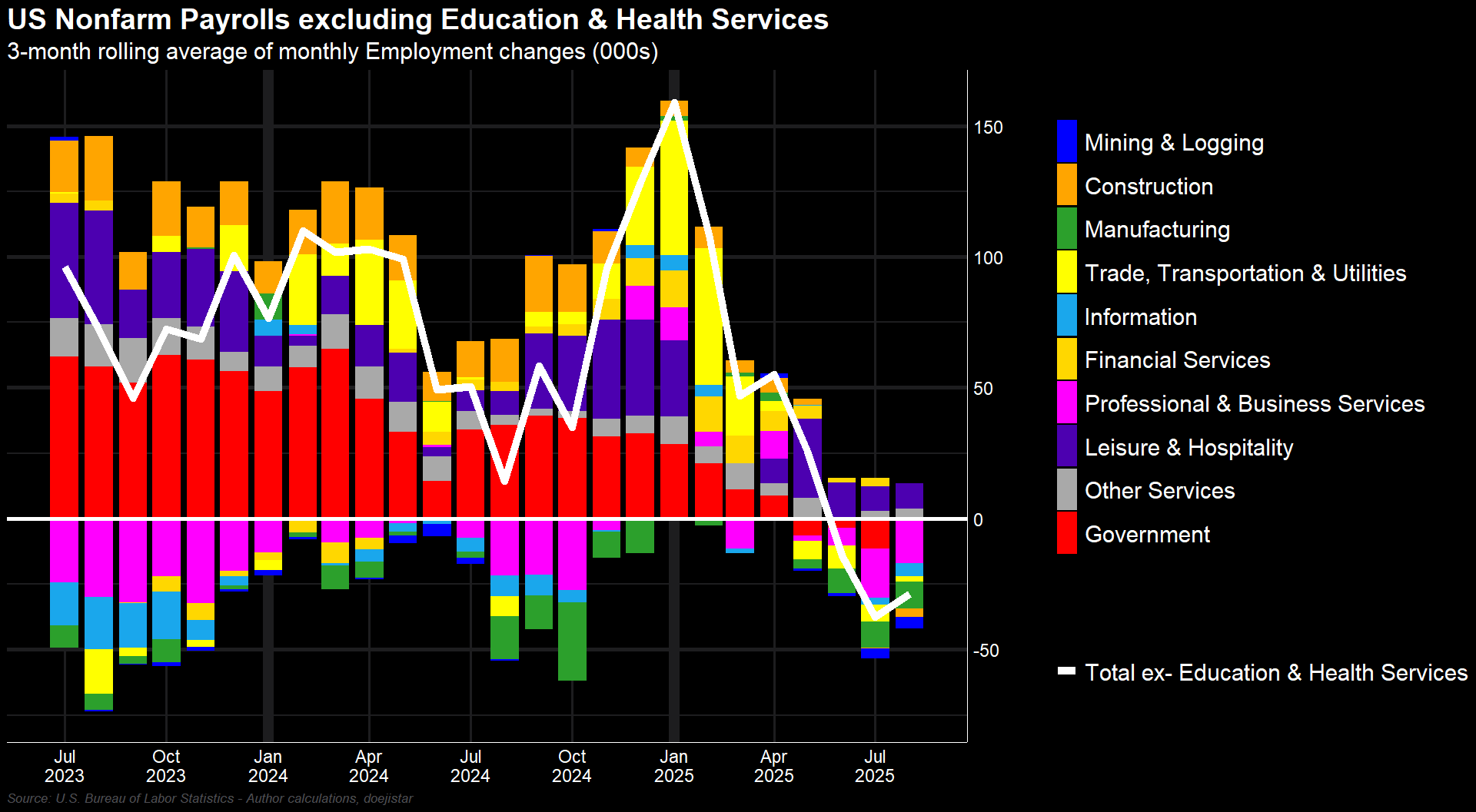 After the big revisions, the 3-month pace of NFP declines has stalled, but its EHS and L&H that is holding up overall job gains.