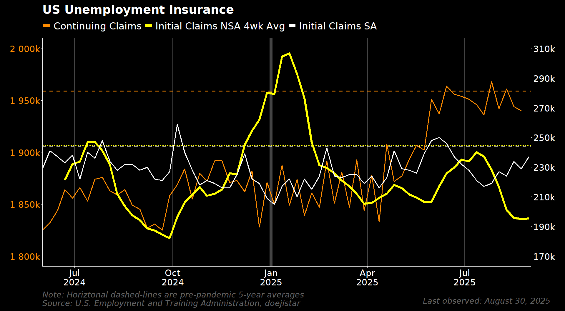 While the headline initial claims number did see another weekly rise, the trend in the unadjusted series (in Yellow) has been declining since July and has more recently remained stable hovering just above 190k for a 3rd straight week. Continuing claims also saw a 2nd consecutive weekly decline also.