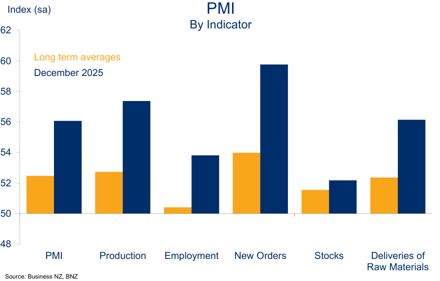 The December NZ manufacturing PMI printed its strongest reading in 4 years, 4.5 points higher than expected at 56.1 and 4.7 points higher than the prior month's 51.4 print. This certainly helps to bolster the case that the pickup in Q3 GDP can be sustained.