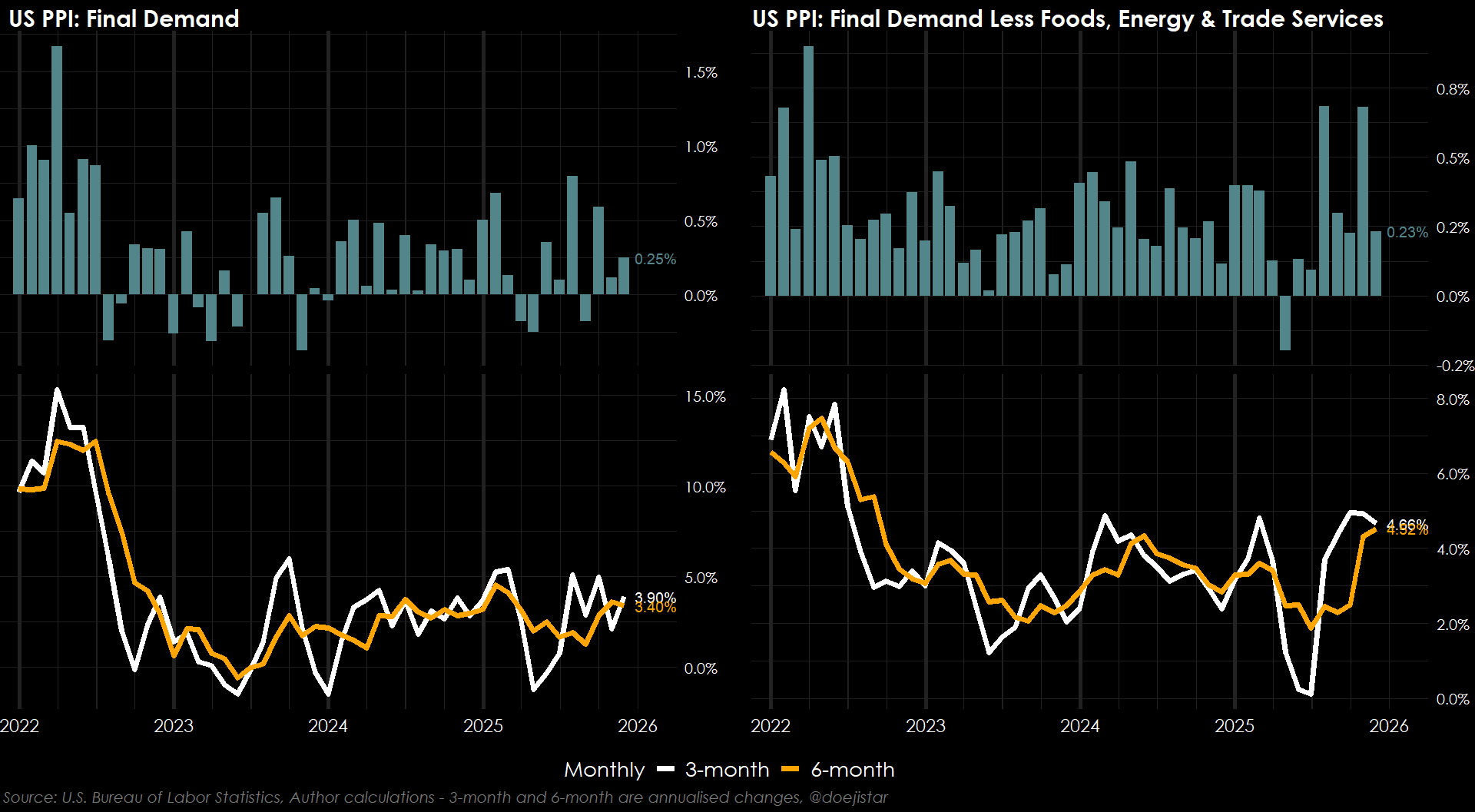 December reports suggest inflation is somewhat softer than underlying trends but remains firm with some evidence of persistent stickiness - e.g. the sticky CPI basket saw a jump higher and PPI continues to point to ongoing upstream price pressures at the wholesale level. All in, I don't think these reports will change the FOMC's current stance and risk view on inflation.