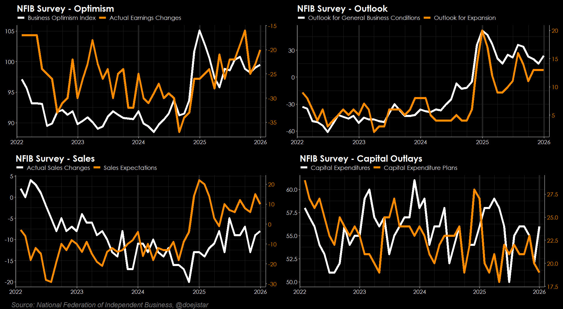 NFIB Small Business Optimism Index rose 0.5 to 99.5 in December, staying above its 52-year average of 98 for a second straight month with businesses reporting increased profitability and sales also for a second straight month. Expectations for better business conditions jumped 9 points to a net 24% to put its first monthly rise since July.