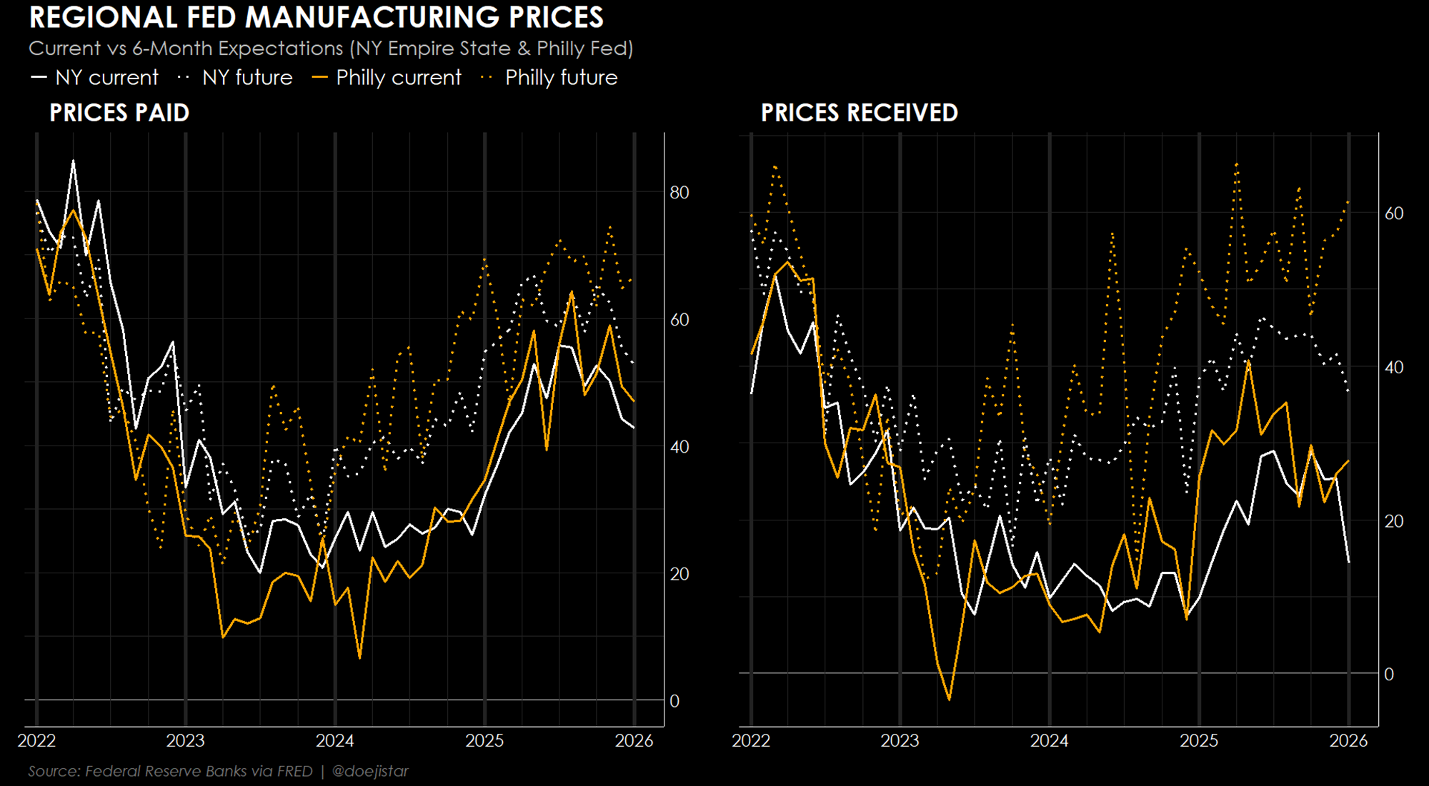 Input cost pressures as well as prices received appear to be moderating, though expectations to receive higher prices remains firm particularly for the Philly Fed survey.