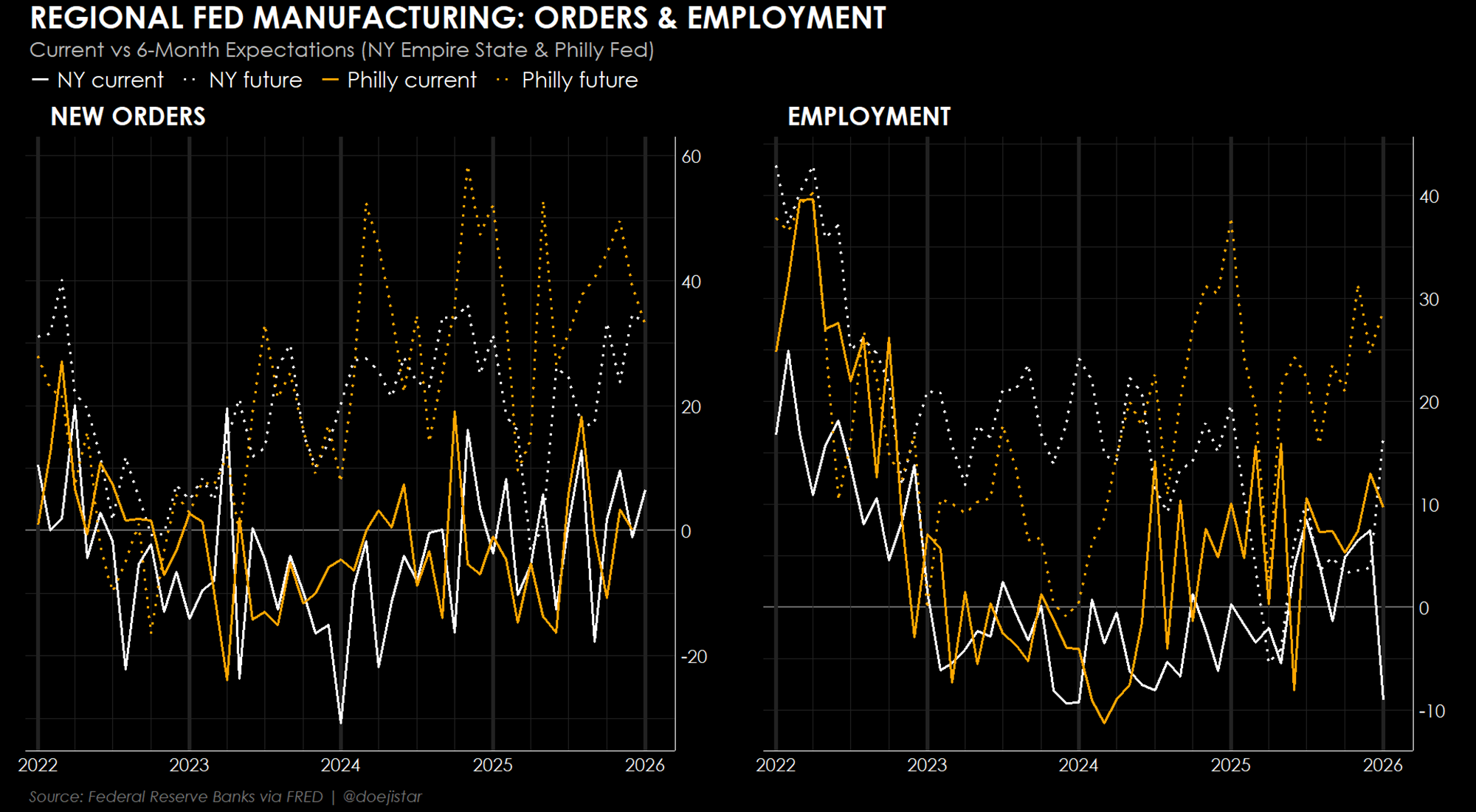 Trend in New Orders looking a bit more positive while Employment is mixed though perhaps nothing to be concerned about - expectations for future employment increased against the drop in current employment.