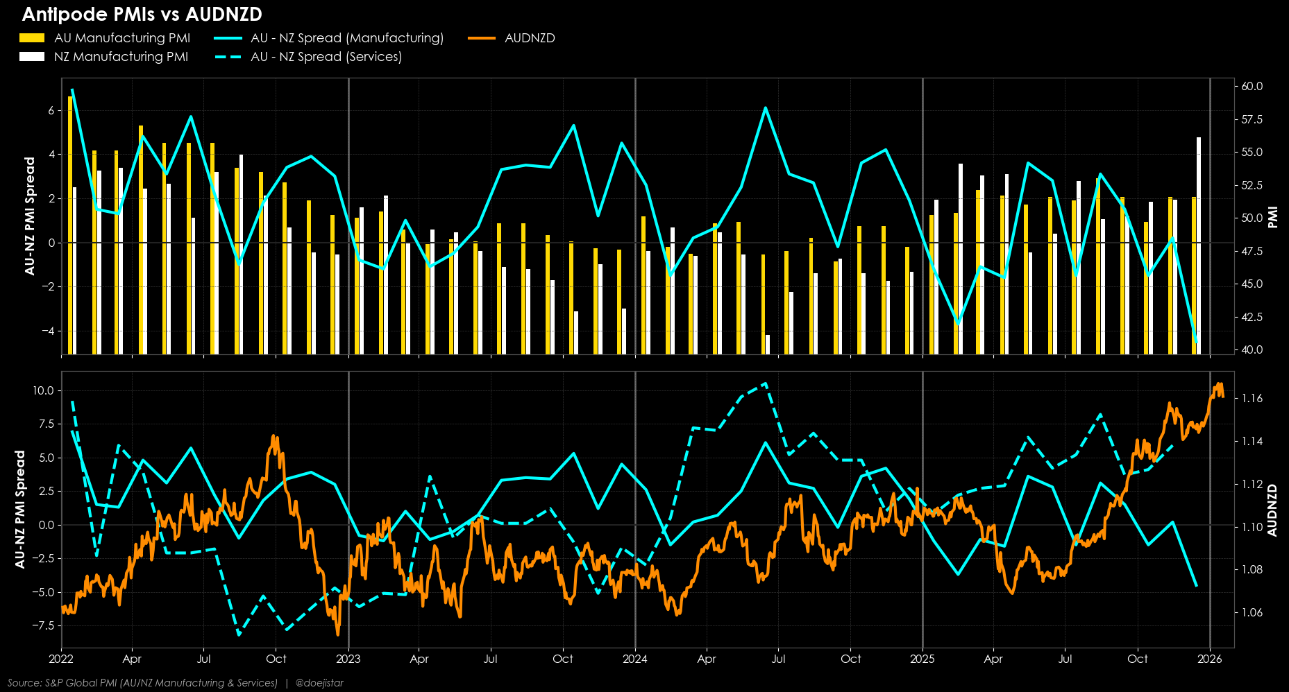 Readings were strong well above longer term averages across the board, but Services on the other hand will need to see a big pickup to be wholeheartedly positive on the NZ economy. It has been in contraction for a good part of the last 2 years (contraction readings for 25 of the last 30 months) with the last reading at 46.9 for November, and we look forward to the December reading on Tuesday to weigh in on our already increasing conviction of some NZD outperformance.