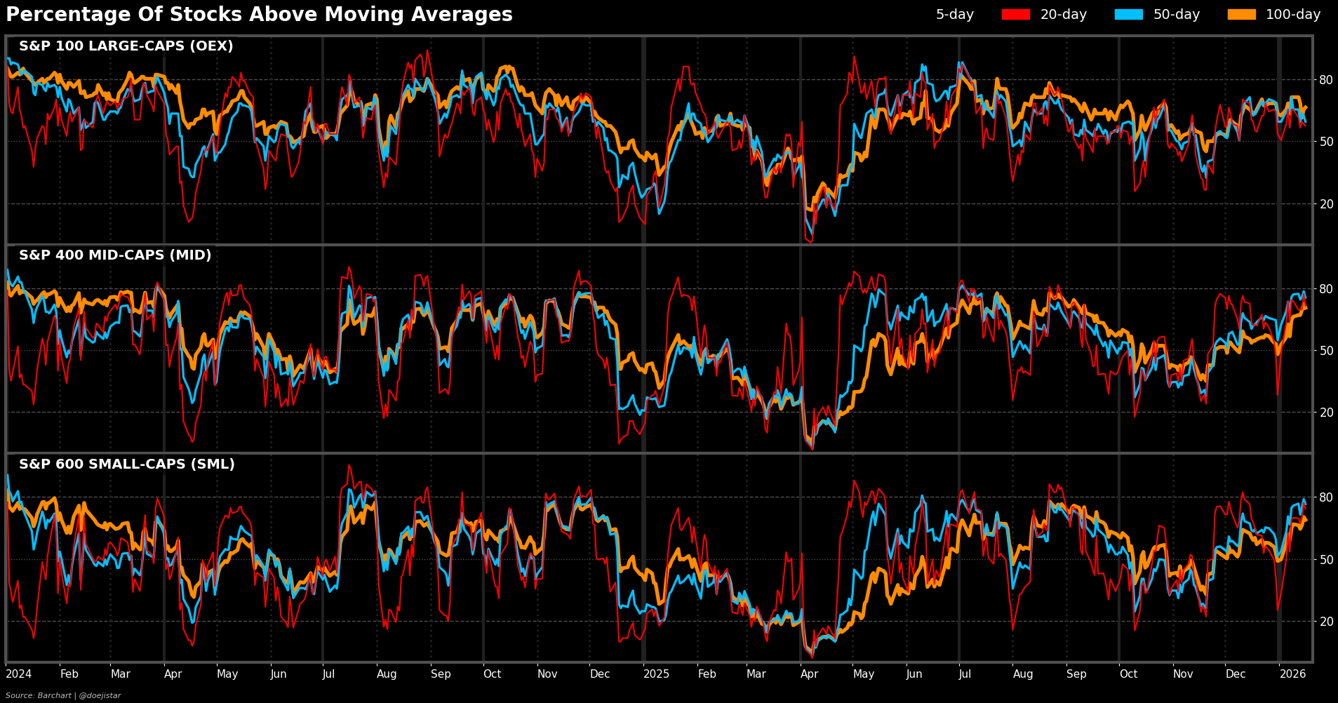 A strong majority of Mid & Small-cap stocks are trading above their 20, 50 and 100 day moving averages and are typically at risk of unwinding when approaching these levels; particularly when the 50-day series (blue) reaches the 80% threshold.