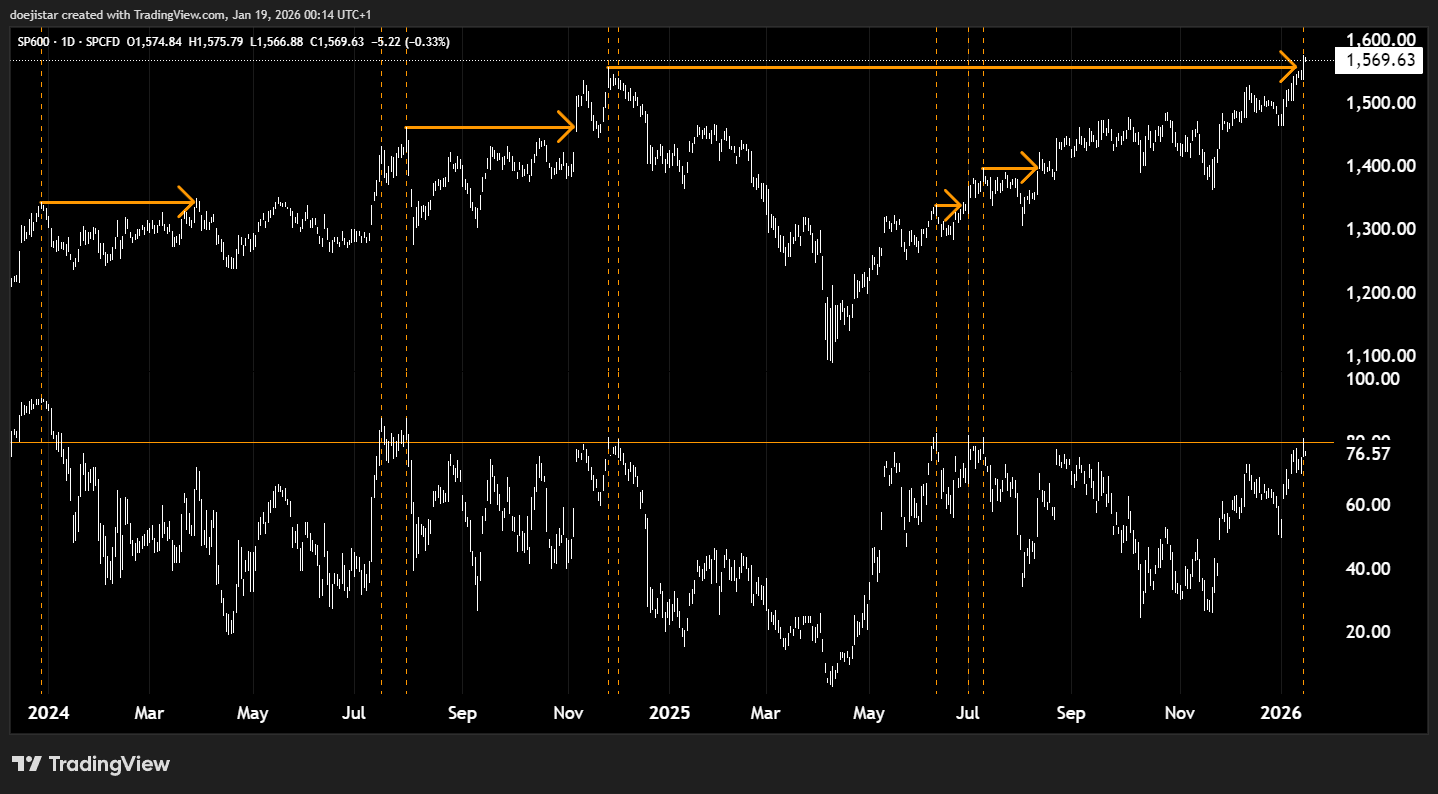 For example, the high in last July wasn't exceeded for another month when reaching similar levels; earlier in May we saw a slight pullback without a higher high in over 2 weeks, and before the November rally of 2024 high was not exceeded until just last week - over a year.