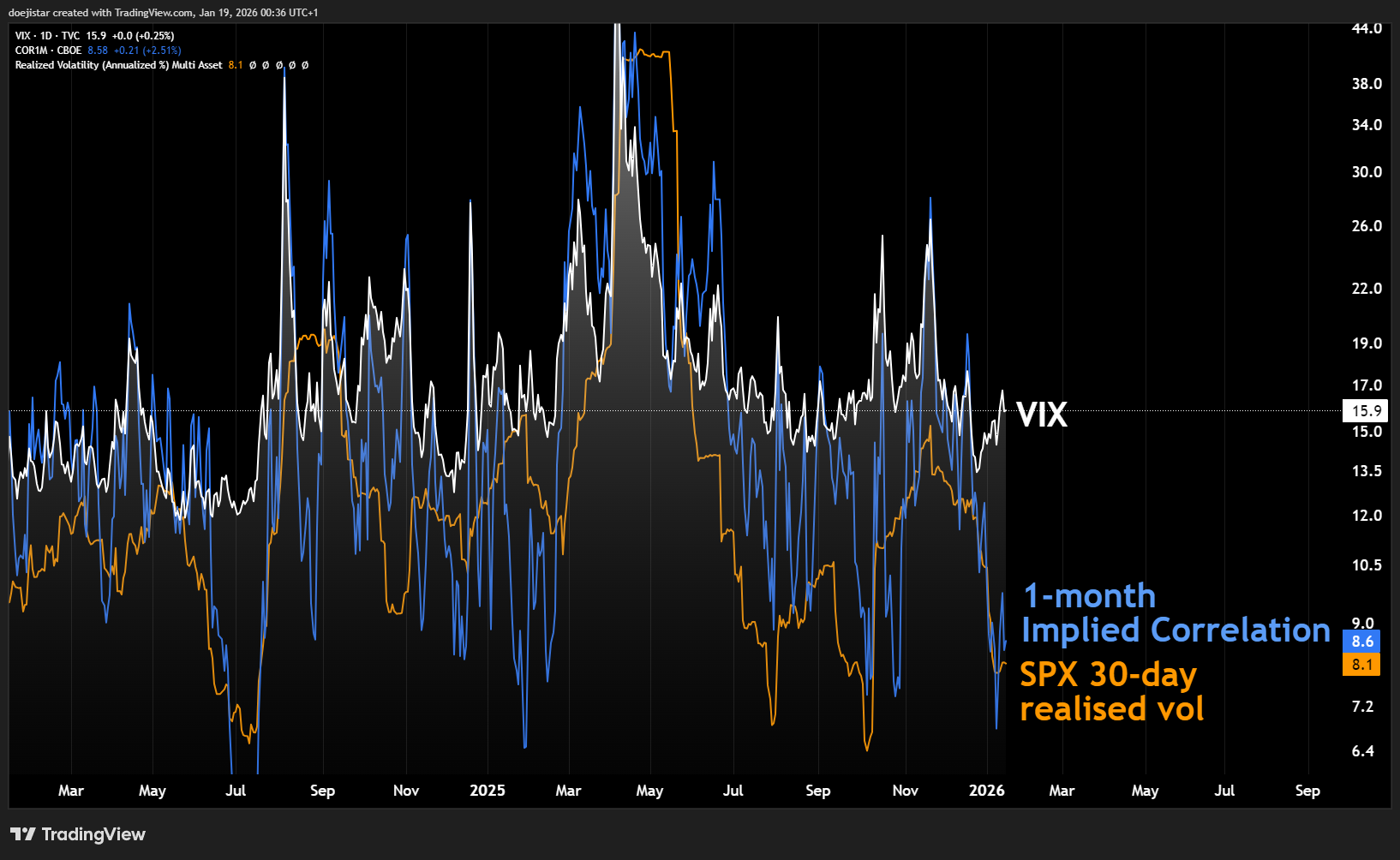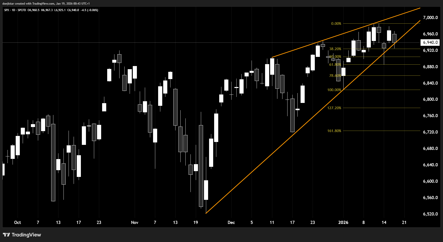 1-month implied correlation being at low extremes also suggests the vol-dispersion trade is fairly crowded, and we are starting to see vol pick up ever so slightly over the past week. SPX closed the week slightly down -0.38% with a long indecision bar with a larger weekly range than the previous week. The Daily chart is showing a wedge-like structure and looking technically vulnerable to further consolidation to the downside than a grind higher.