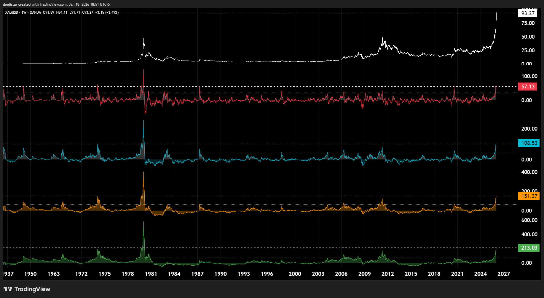 This silver rally is truly a sight to behold, tripling in price within a space of a year. This is a historical level of 'stretched', only exceeded by the Silver-Thursday event back at the beginning of 1980 in magnitude from the 50, 100 and 200wma's.