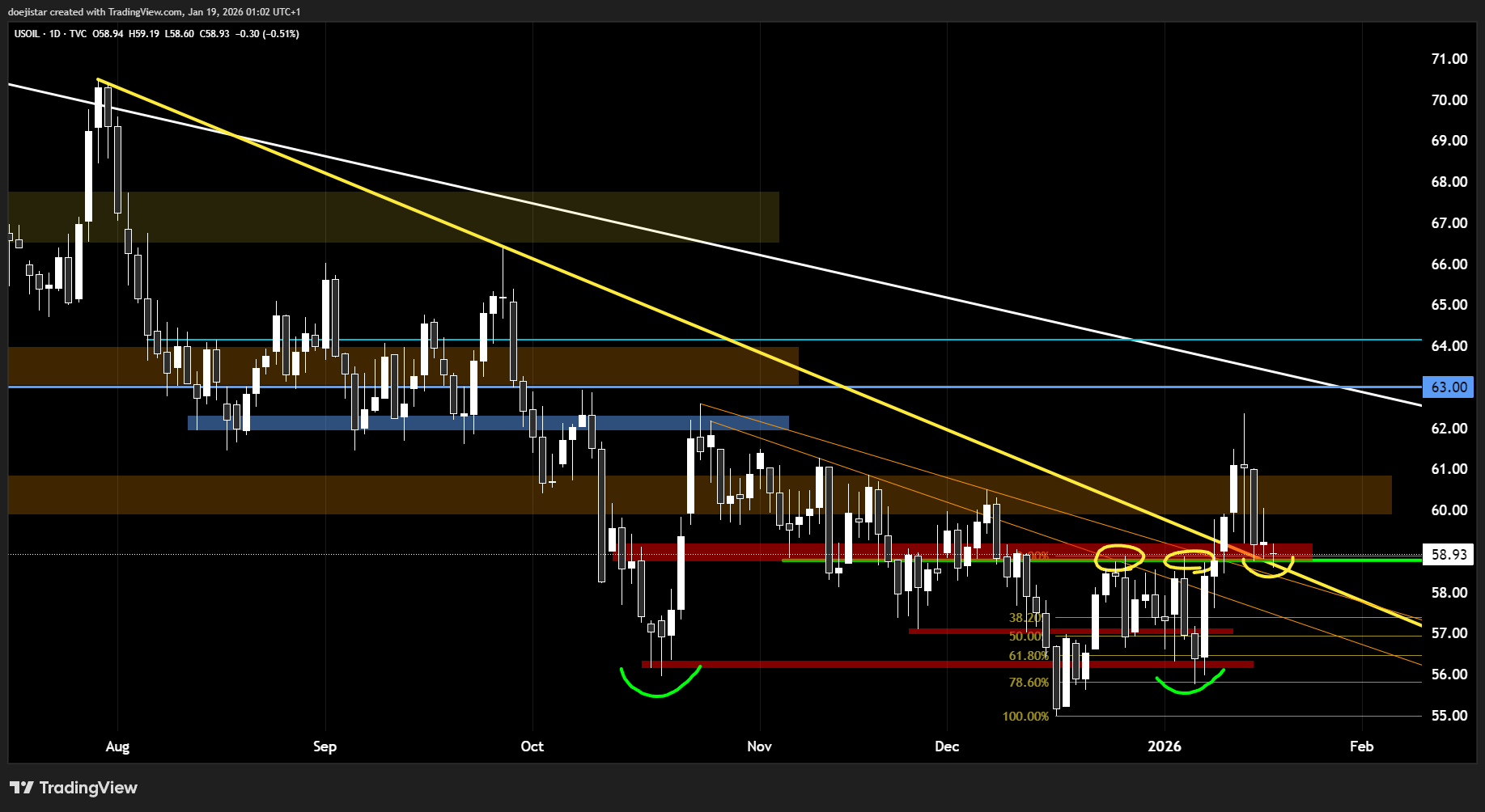 On the other hand, a much easier trade in commodities would be long Crude. Technically sound - strong impulsive breakout above the 59 handle and trendline with last week's retests holding up so far with contracting indecision bars. Outside the chart, geopolitical tensions are high and I would expect geopol premiums to provide support.