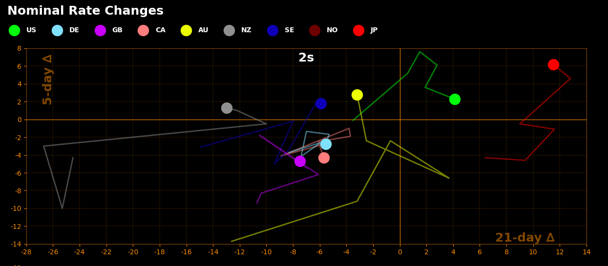 Looking at recent changes 2 year yields, USD and JPY seeing the most positive changes while GBP CAD and EUR the most negative. Those are very much in line with some of my thematic views and do see them continuing to play out.