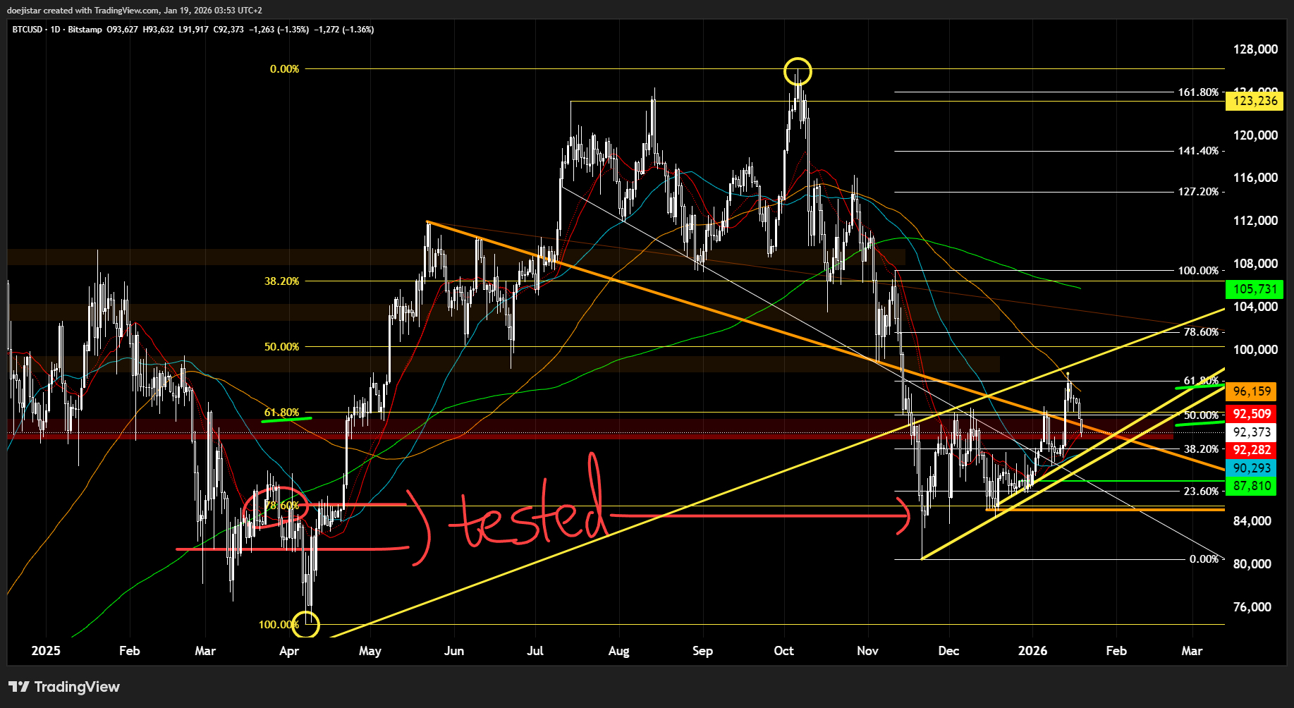 BTC rally has found resistance at the 61.8 fib retracement of the November sell leg and 100dma, and now trades below a well observed trendline (orange). There is solid support at the 92k level, but I don't think this level will hold up based on the ascending A-B-C wave bearish consolidation structure amid a higher level of geopolitical uncertainty to dampen risk appetite. On the top side, 94k has been important resistance of which the recent breakout has failed to sustain as support.