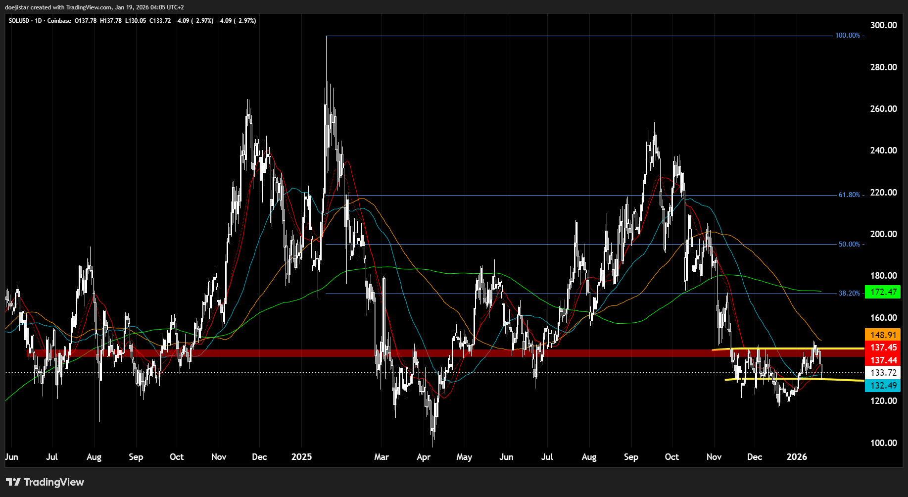 SOL is also back to a critical area of a support and looks the most appealing of the 3 for dip-buying ideas on a purely technical view. But given the potential macro impact on risk assets as a whole, I'd say it's difficult to be constructive with any conviction until it is back to pressuring the red pivot area and neckline at 145 for a break higher.