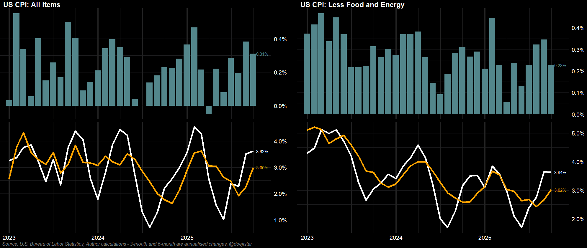 US CPI report for October was softer versus the prior month and against expectations. Headline came in at 0.31% versus 0.4% expected, and Core CPI was 0.23% versus 0.3% expected.