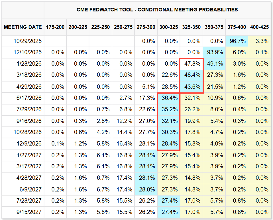 This report reaffirms the likelihood that the Fed will go ahead with the 25bps cut this week, and also leaving the market to fully expect a 3rd consecutive cut in December also that would take the fed funds target range to 3.25-3.50%. Looking into what's priced for 2026 (Table), the market fully expects 2 more cuts next year though far less clear about the exact timing of those cuts - roughly 1 in the 1st half and 1 in the 2nd half of next year.