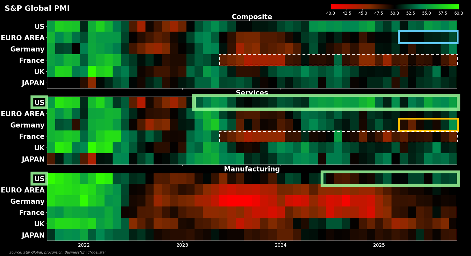 US continues to dominate the major economies, maintaining the higher PMI readings in both Manufacturing and Service sectors (Green). Europe extended their slow and steady trend of accelerating activity, Flash composite PMI rose to 52.2 in October and from 49.7 just 5 months earlier (Blue), Germany Services putting in a strong rebound to the highest Flash Services PMI to read 54.5 in in 30 months (Orange). UK and Japan appear stable, but France is notably showing a more recessionary outlook of this group (dashed White).