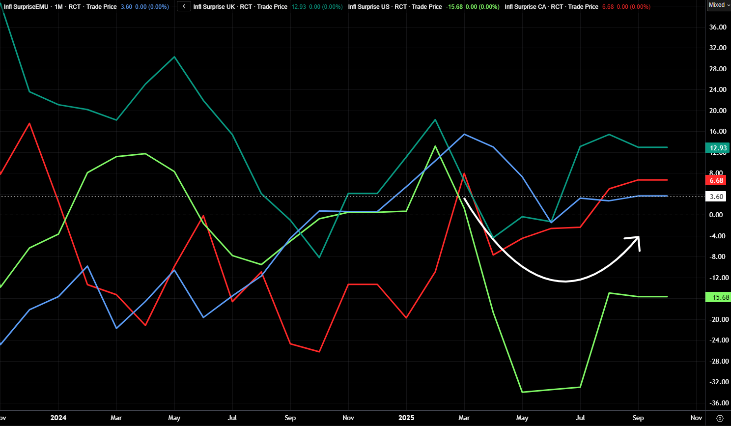 We've also had inflation data from Canada and the UK last week. Canada posted a 0.1% m/m increase against the -0.1% expected. UK inflation reports came in softer with yr/yr readings print 2-tenths of a percent softer than expected and decelerating from the prior month's reading. Those and the softer US CPI report should ease inflation upside risks which, has been rebounding since May, and could further be booster by base effects at the start of 2026.