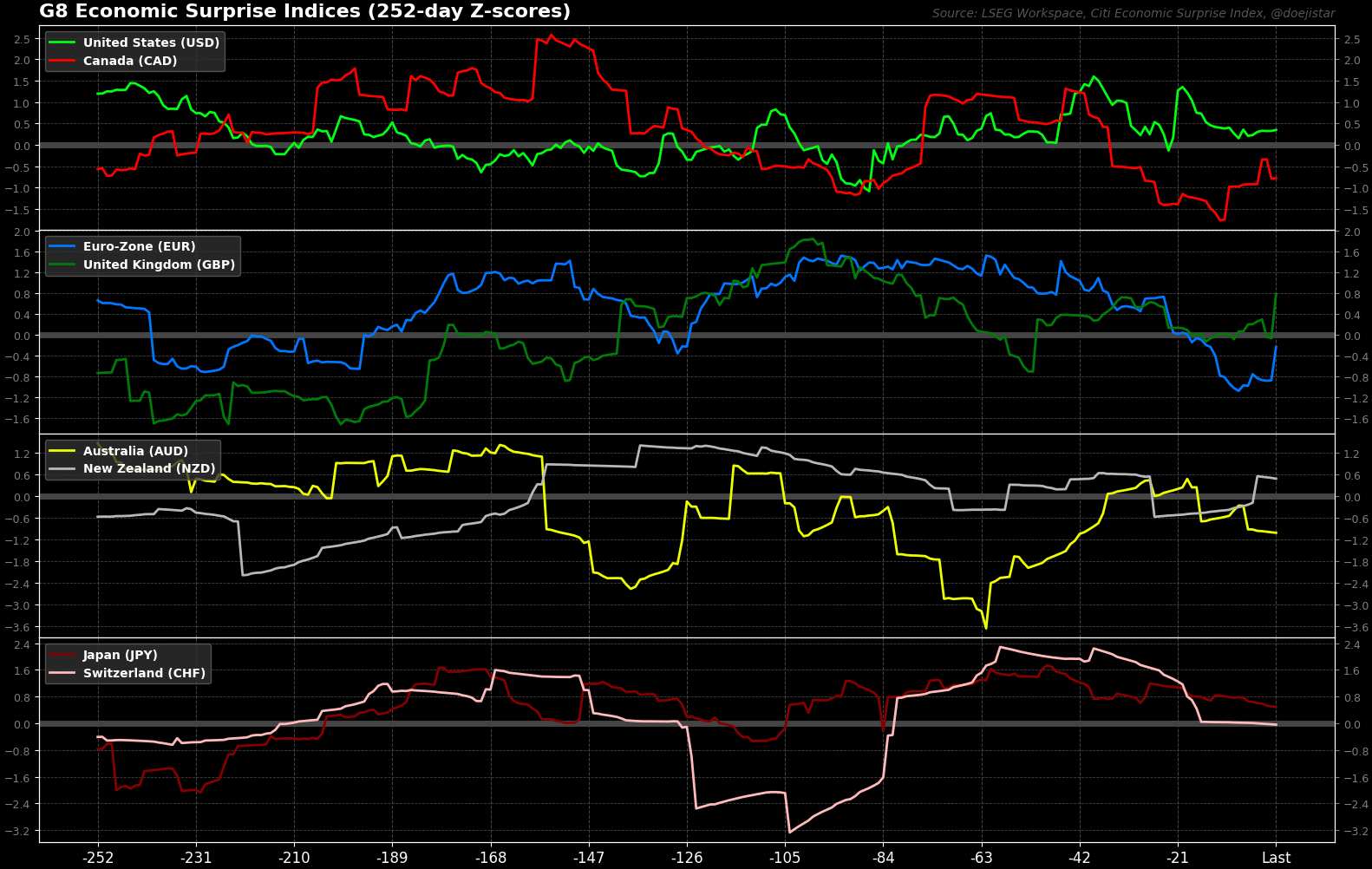 Top 2 panels with US CA EU and UK are positive, whereas bottom panel shows softness in economic data releases with the exception of New Zealand.
