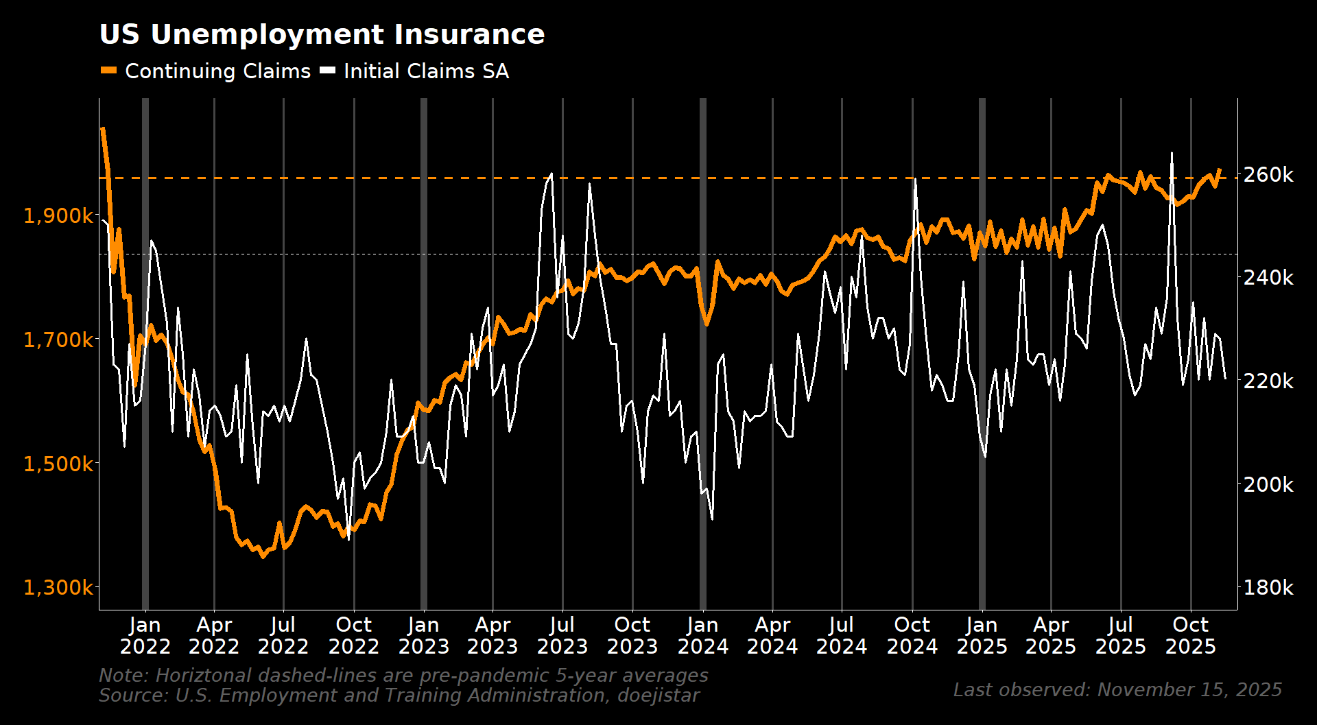 Initial unemployment claims was to 220k for the week of November 15th, 10k less than the 230k expected. Continuing claims rose to a new cycle high.