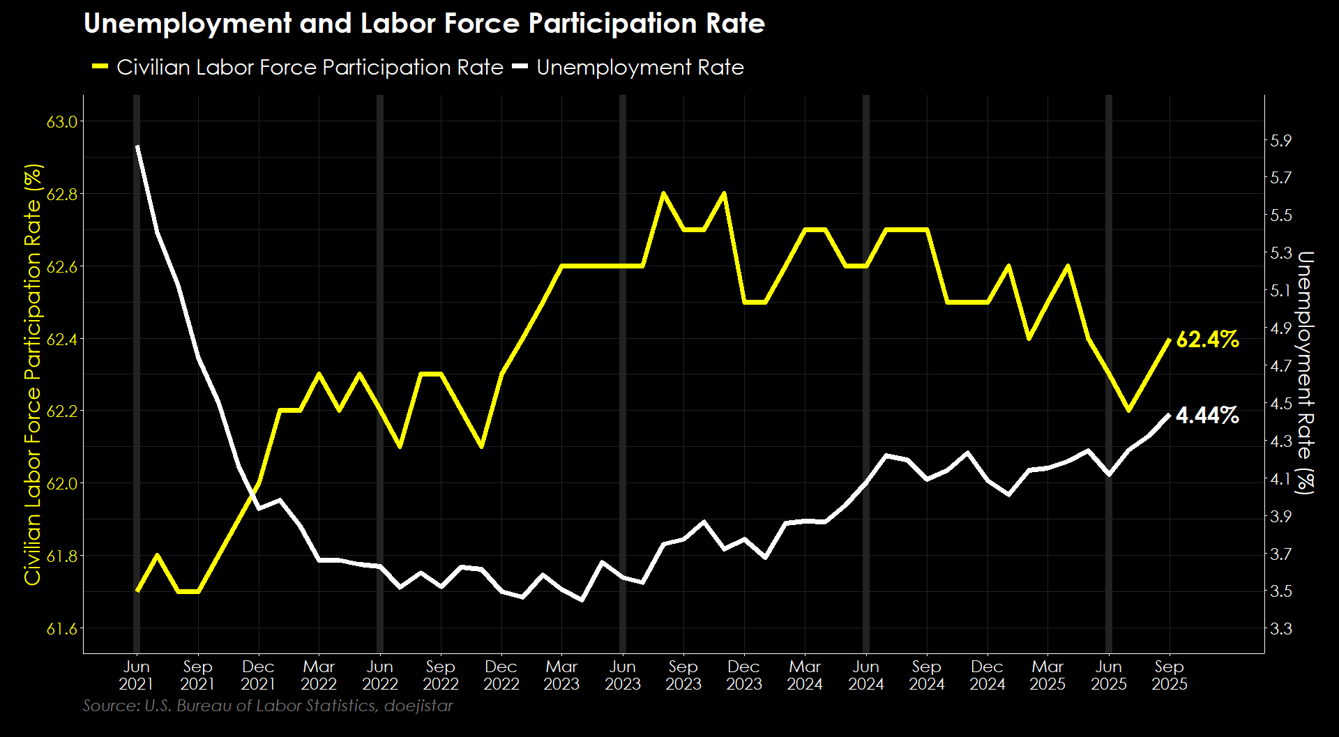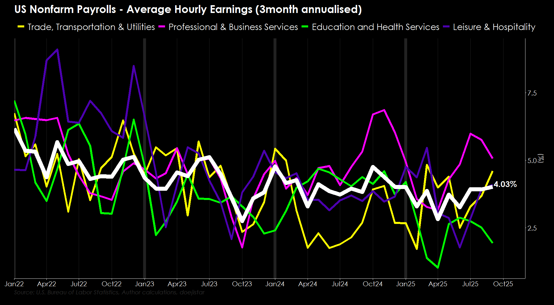 It will be interesting to see how the October report looks after the Challenger report which, garnered a lot of attention among commentators and macro strategists, showed a huge spike in layoffs that month. In any case, that 4.44% unemployment rate needs to be taken with a large pinch of salt for the time being.
