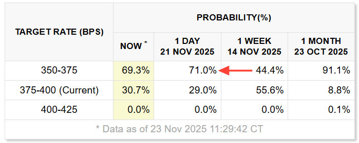 - Waller (V): available data strongly supports a demand-driven slowdown; underlying inflation is "relatively close" to the 2% target when tariff effects are excluded; medium- and longer-term inflation expectations remain well-anchored; supports December cut as "a matter of risk management".