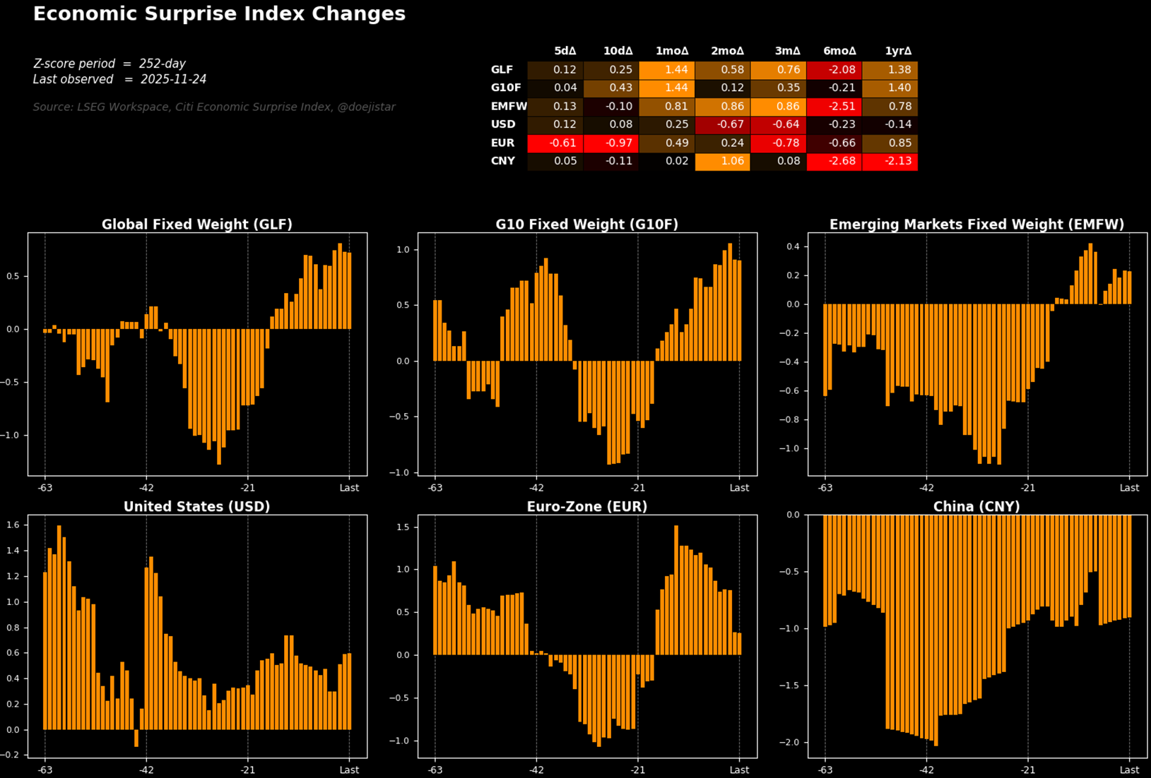 US data show a still-resilient economy. The December FOMC meeting looks finely balanced, with a split between those pushing for another cut and others expressing a greater deal of caution. Globally, the US and Australia remain relative bright spots while the UK, Eurozone and parts of Asia show softer but mixed momentum. Markets have had a rough week, led by China tech and US mega-caps, but breadth and sector signals and positioning hint at stabilisation if realised volatility can subside from here. In FX and rates, safe-haven demand has supported Treasuries and also the dollar - thus making the divergence in rate differentials and the USD to be taken with a pinch of salt, and we highlight upcoming event-driven opportunities, particularly in AUDNZD and EURGBP which will be explored in more detail, as well as other views and ideas in the Technicals section.