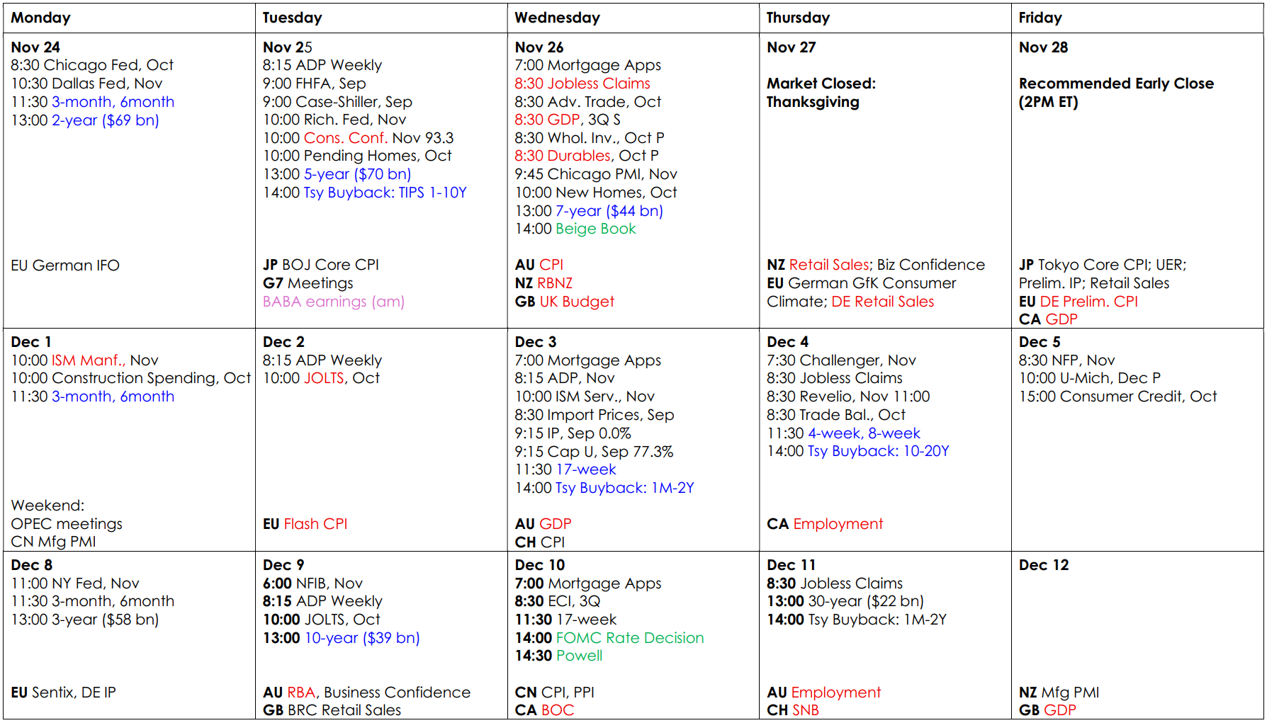 - Collins (O): "the current policy is in a somewhat restrictive range following the 50 basis point reduction we made in September and October, and that seems fitting" given present economic conditions; "I do see reasons to be cautious" for December; previous mentioned "relatively high bar" for additional easing in the near term and that policy rate will likely need to stay on hold "for some time".