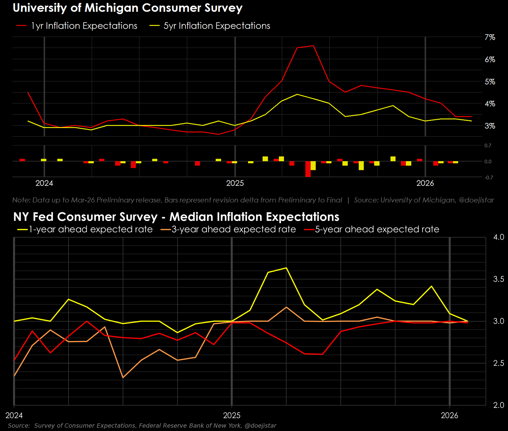 Consumer inflation expectations have also eased, but the risk is to the upside for the Final UoM release and NY Fed survey for March given the 20% surge in average Gas prices so far this month, and almost 30% so far this year.