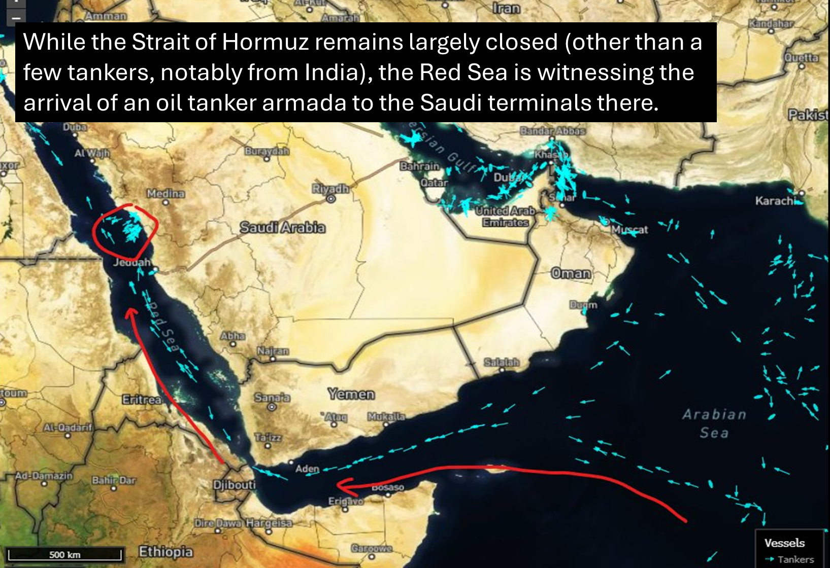 - Ships are passing through the Strait of Hormuz. Reports as early as last Tuesday asserted that Chinese bulk carriers and a Greek oil tanker have passed through the strait, and in more recent days - TankerTrackers.com observes oil has been transported out through the Strait. Javier Blass also reports that tankers are opting for the Red Sea terminals: