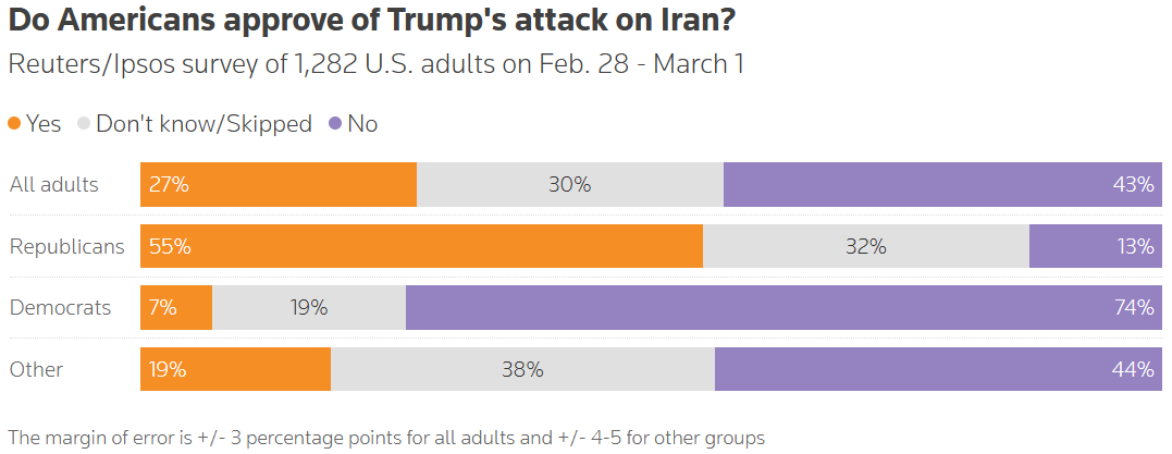 2) Political calculus points to the conflict being far from over: The most politically damaging thing that Trump can do now is to TACO and effectively abandon victory. Domestic polls show 27% support goes to 40%+ if "mission accomplished" is declared. A regime change is quite simply the best political outcome for Trump as well as it would be for Netanyahu.