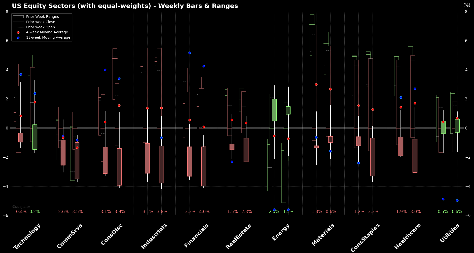 Energy was the standout performer, followed by Utilities. Equal-weighted Technology finished marginally up, but there is clearly a bearish performance profile with the weekly closes pretty much at the lows.