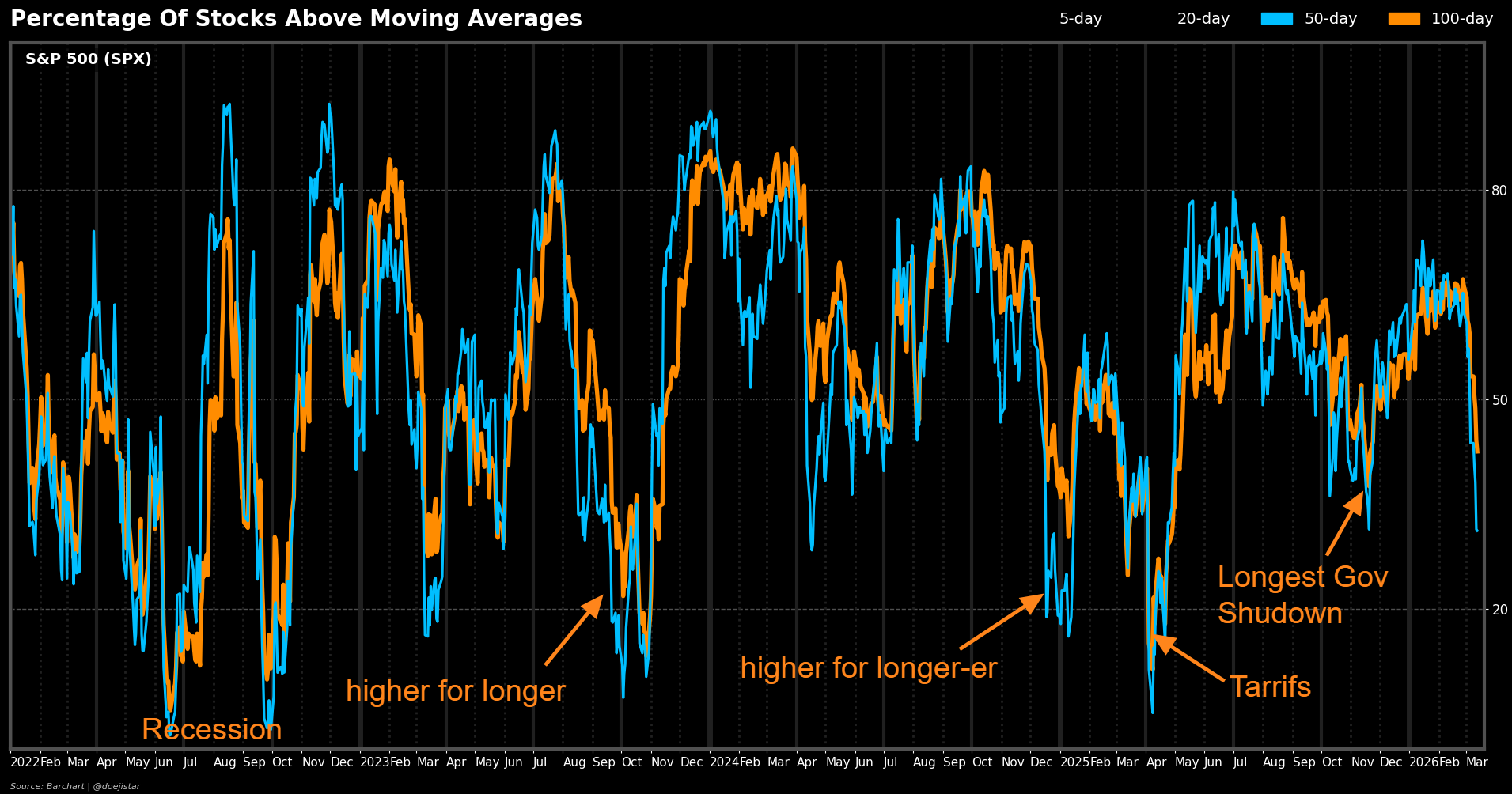 Today, the US economy faces +20% mtd and 30% ytd gas at the pump prices which are likely to have impact on macroeconomic indicators and fed policy. We've seen how the market has shifted from expecting almost 3 cuts before the Iran-war to now 1 cut being a doubt by the end of 2026. That complete change in policy expectations within the space of 2-weeks is so significant that it one should probably take their time to bet against, should they wish to do so, or have a view that it will pare back. Secondly, there is reason to believe that the growth risks that we face currently are far greater than those that existed around the government shutdown because the risks are created by higher Energy prices as a dampener on growth - i.e. stagflation. Those were the conditions that led to a mild recession and equities bear market in 2022. That said, I currently don't see stagflationary risks being as great as they were in 2022, but that is the regime we are venturing into now, and historically, these risks tend not to dissipate as quickly as they have arisen.