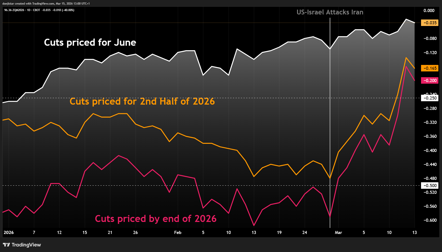 Cutting expectations were pushed back into the latter half of 2026 as inflation began to pick up again, then a cut in 2026 suddenly became a doubt as the Iran-war kicked off with the 2026-end pricing at 20bps.