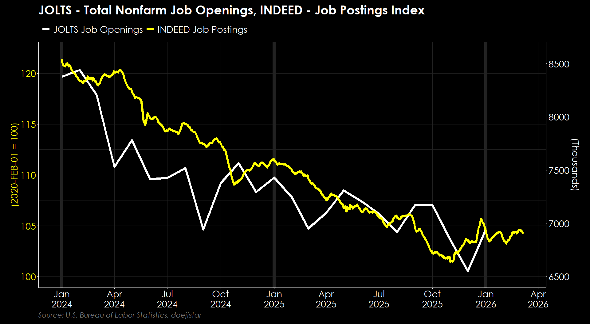 JOLTS openings was 6.9 million, above the prior months 6.6 and above expectations of 6.7. The more up-to-date Indeed data suggests openings have remained stable since the start of the year.