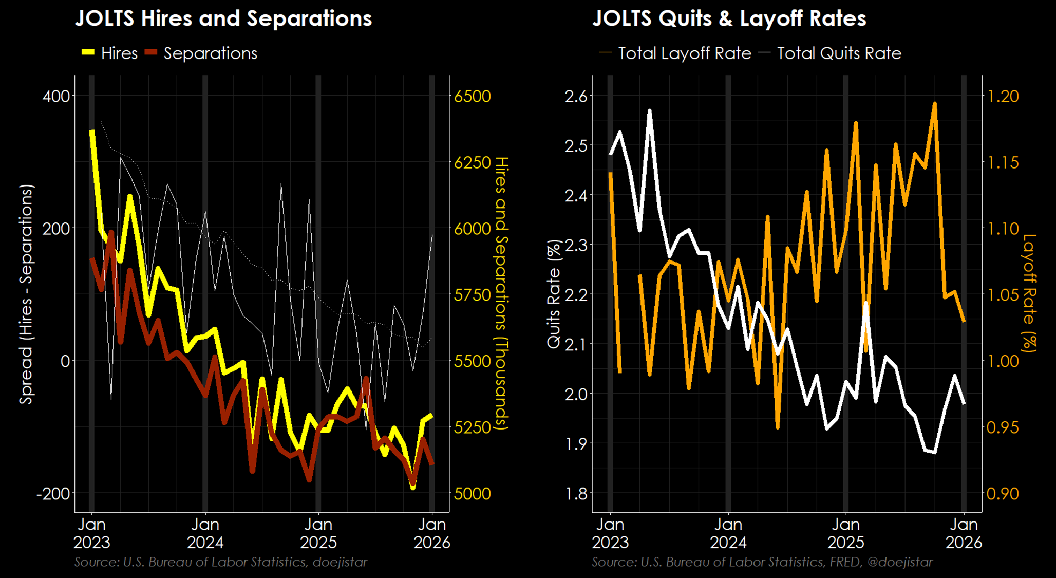There were only slight changes to hires and separations but had both moved in a positive direction with the spread at the highest in over a year. Quits rate was just below 2% and the layoff rate continued to move sharply lower reinforcing the “low-hire/low-fire” environment.
