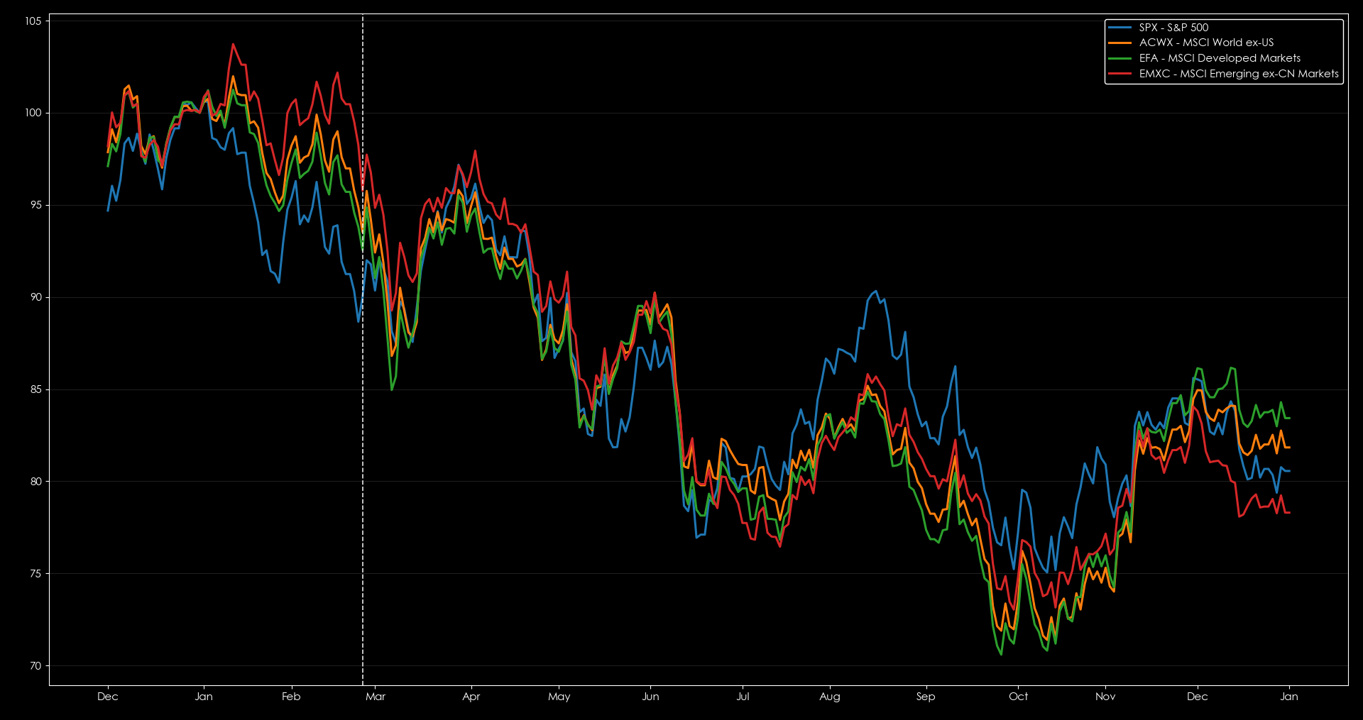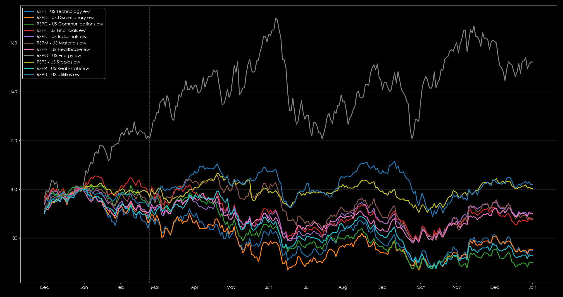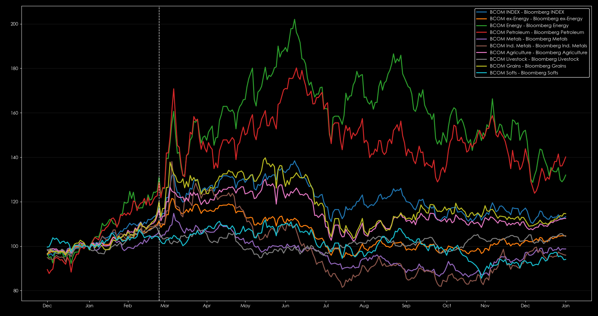 Commodity markets held relatively steady, with Energy as the clear winner. Grains and agriculture also held gains for most of 2022, while industrial metals saw the biggest fall from their March peak. That performance suggests long Energy / short Copper as the theme to watch.