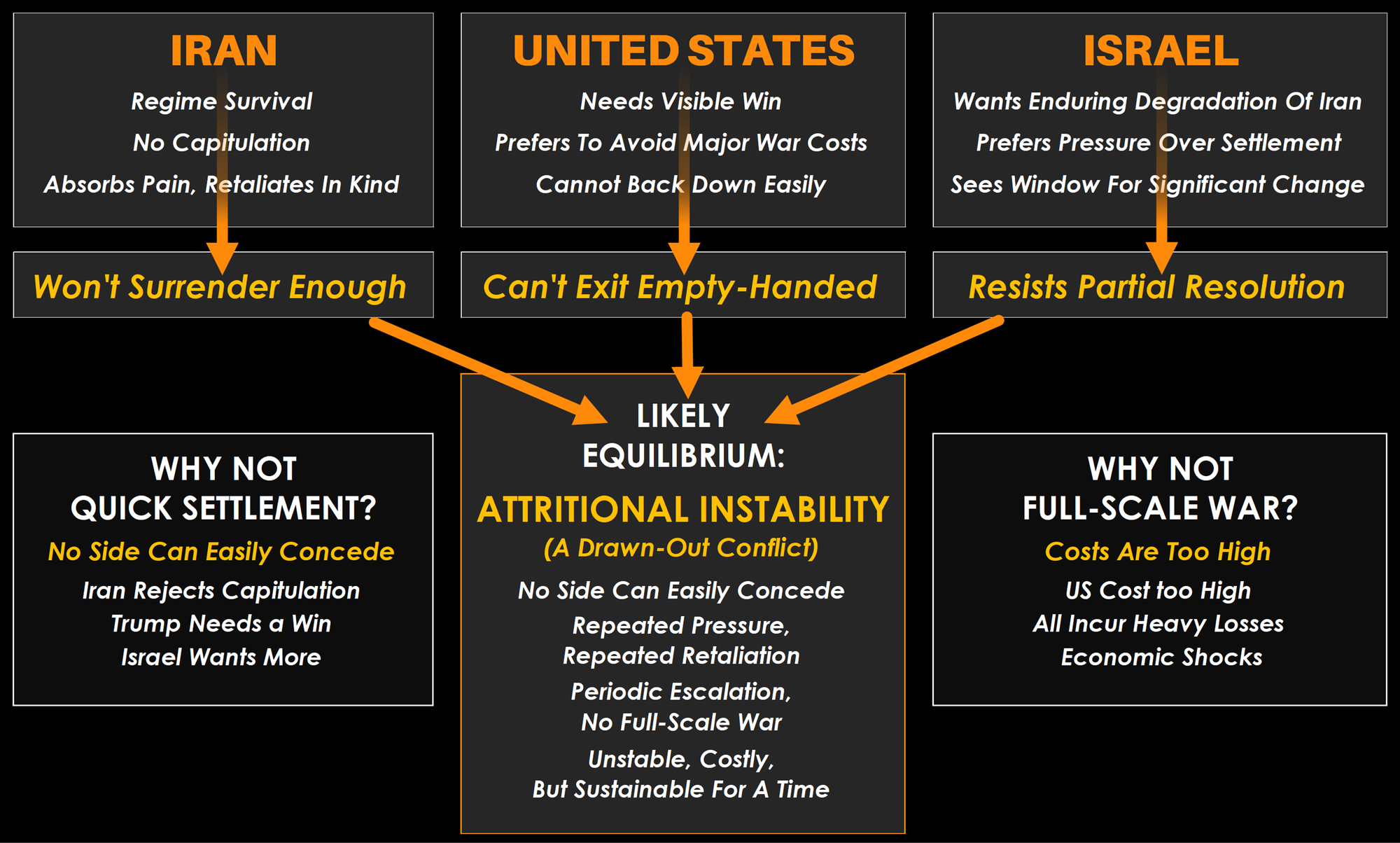 With the motives, constraints, and strategic incentives of each player in view, the most likely equilibrium also points to a drawn-out conflict; Iran is unlikely to concede enough, Trump has too much at stake to back down without a 'win', and Israel is unlikely to be satisfied by an incomplete outcome.
