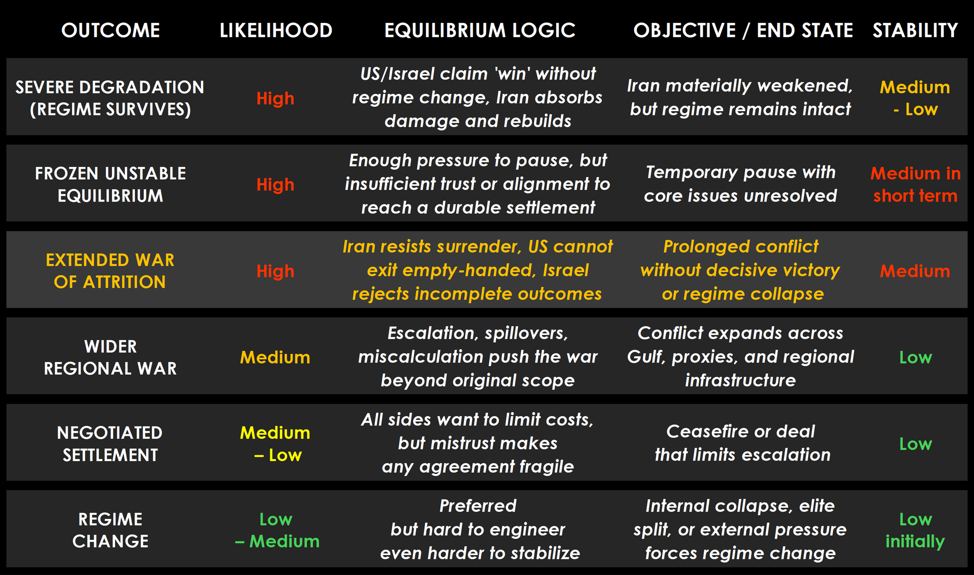 Taken together, the table reinforces that the most likely paths are not the cleanest ones, and that a prolonged conflict is the expected outcome across multiple scenarios. The most probable path remains an Extended War of Attrition, consistent with both my own thesis and the game-theory framework. The other high-probability alternatives are Severe Degradation, which would involve intensive military action without regime change, and a Frozen Unstable Equilibrium, which would imply a pause in active conflict but with underlying tensions and military risk remaining elevated.