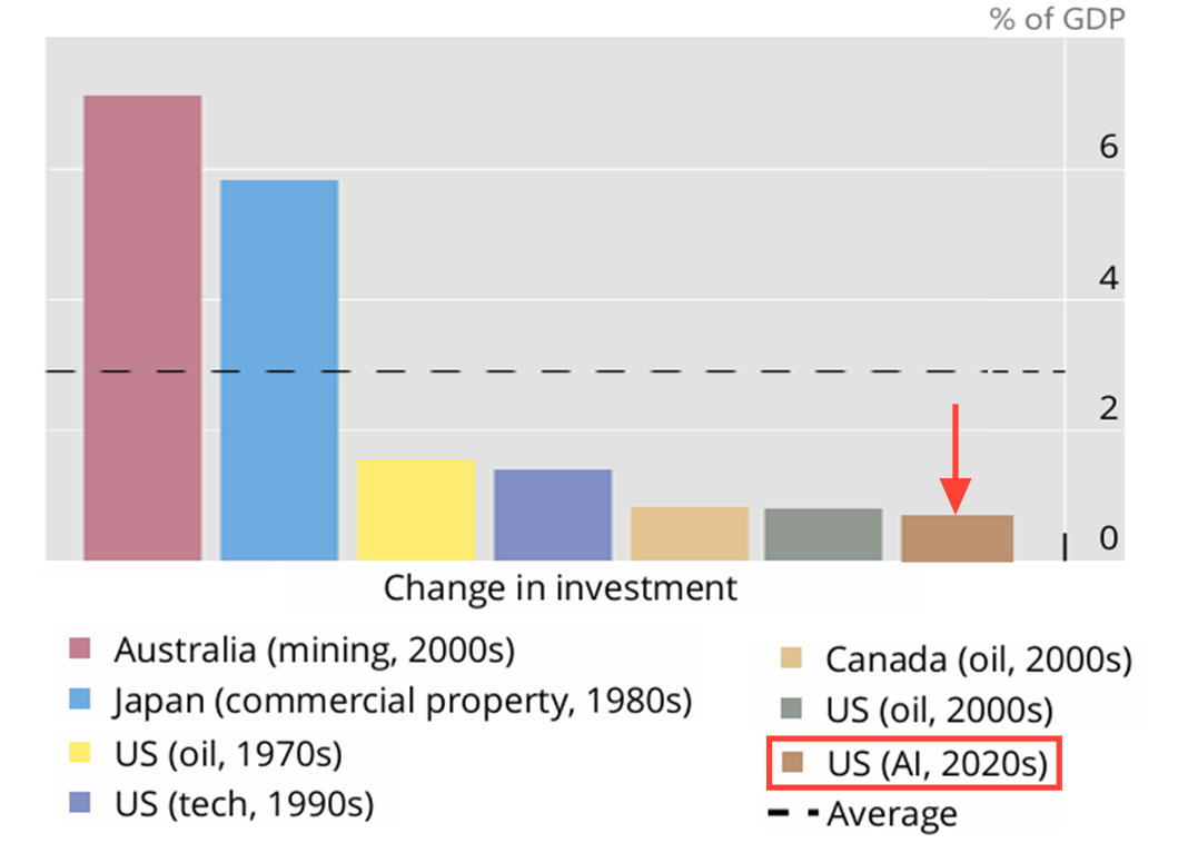 AI Capex is still in acceleration - this implies that we are still in its early innings, and anecdotally we are still seeing a plethora of AI related investments from all over the globe. Until this Capex cycle is showing signs of peaking, I'd say the bubble/boom is far from over. Going back to the BIS article we've touched on in prior notes to provide some perspective on this, they showed that the current level of AI-capex (approx. 1% of US GDP) is just half of the Dot-com boom, and one-fifth of Japan's/Australia's property/mining booms.
